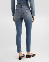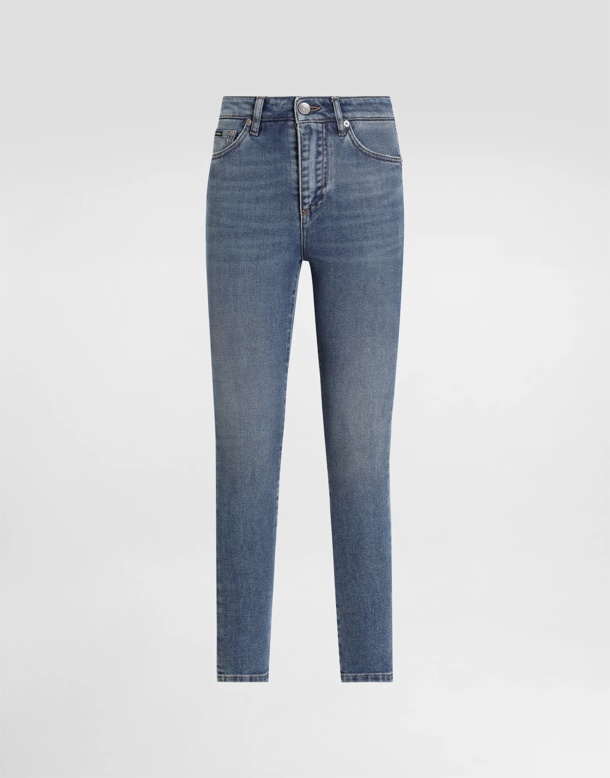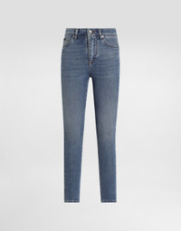 Skinny cotton denim jeans: • Blue • High-waisted • 5 pockets • Branded label on the coin pocket • Branded metal and leather tag on the back pocket • Inner leg: 73 cm • Hem: 13.5 cm • Zipper and branded metal button fastening • The model is 175 cm tall and wears a size IT 40 • Made in Italy External composition: 98% Cotton 2% Spandex