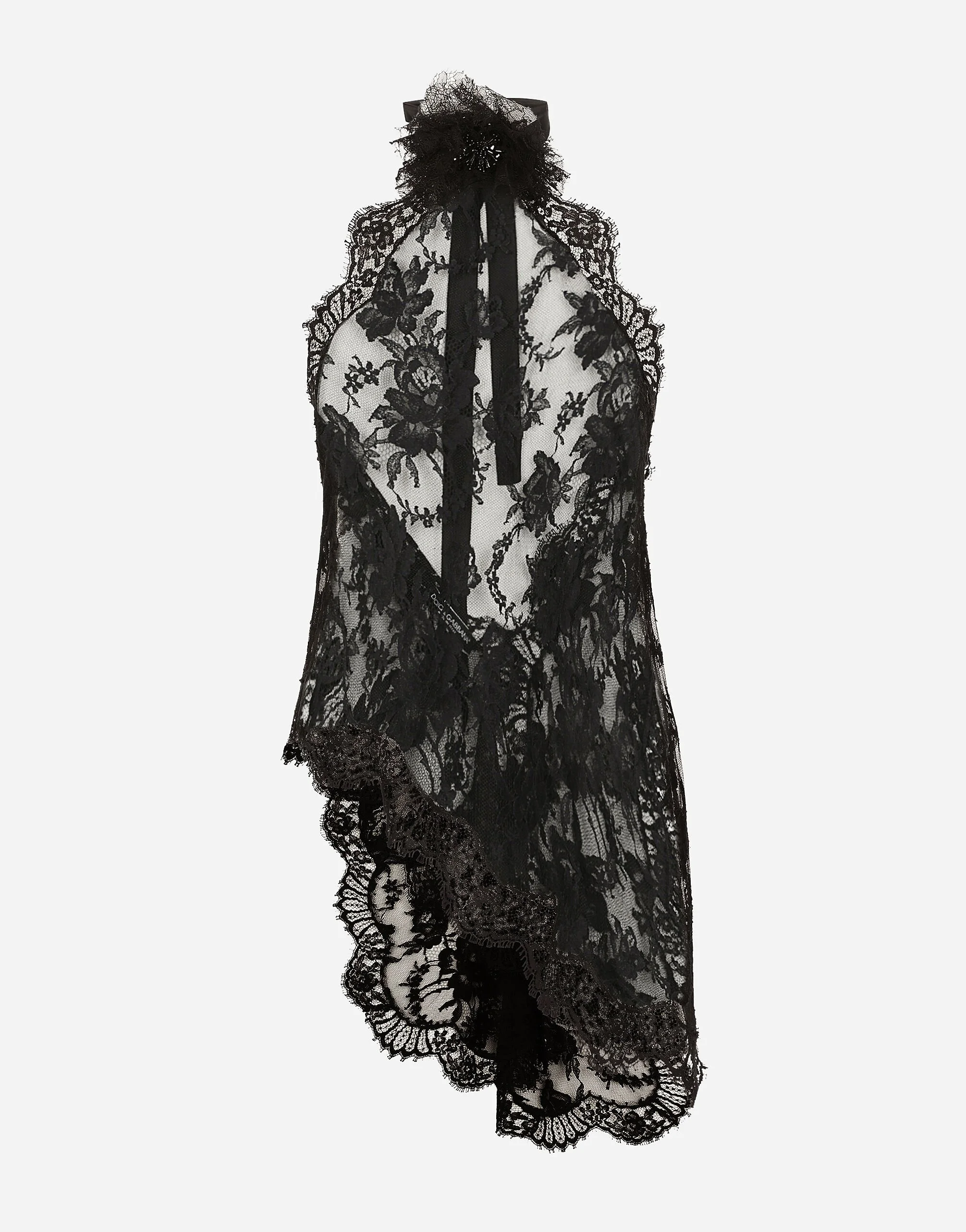 In the “WOMAN SS 24” Collection, the imagery of old Sicily interacts with the masculine, with sensual shapes, lace, nude tones and delicate overlays, to create pieces that move amid clean silhouettes, the elegance of the 1960s, the contrasts of black and white and luxurious textures. The designers are reworking their signature style and their iconic Sicilia black color to convey an aware, seductive and confident Sicilian WOMAN who is imbued with sensuality. Asymmetrical Chantilly lace top with flower detail on neck: • Black • Halterneck • Sleeveless with rear neckline • Regular fit • Tulle lining • Half-zip fastening on the back • The piece measures 60 cm from the center back on a size IT 40 • The model is 175 cm tall and wears a size IT 40 • Made in Italy External composition: 68% Cotton 22% Polyamide 10% Silk Internal composition: 100% Polyamide