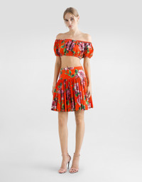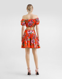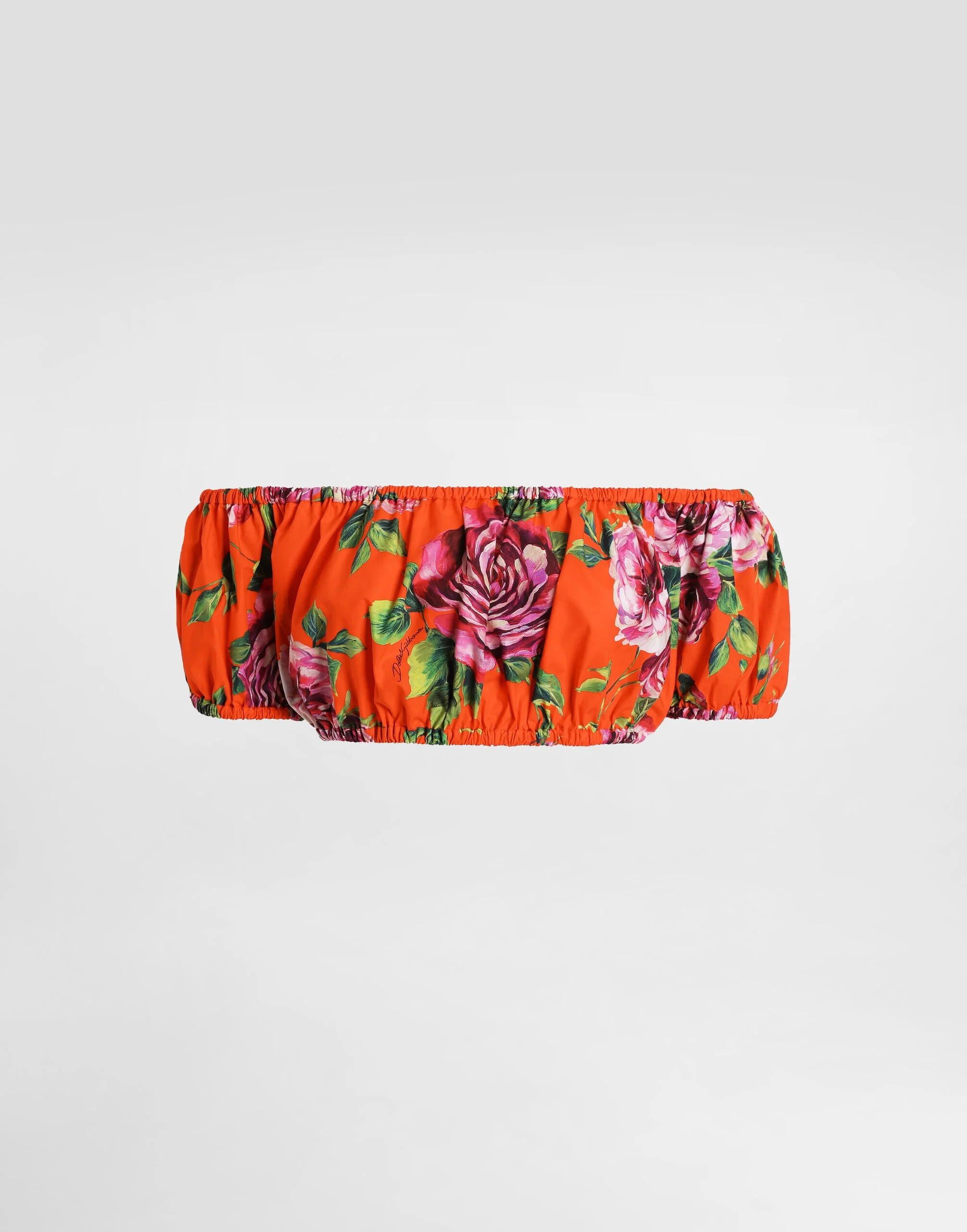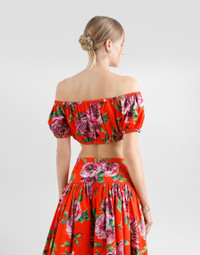 The Spring/Summer 2025 Warm Weather Collection is an ode to floral beauty, enhancing the elegance and vivacity that define the brand's DNA. Refined colorful bouquets envelop light dresses, skirts, pants and beachwear, adding a romantic and fresh touch. Accessories, such as scarves and headbands will stylishly pair with all looks. A riot of color and corollas that once again attest to the brand’s unique and unmistakable character. Cotton poplin Bardot-neck crop top with rose print: • Multi-colored • Bardot neckline • Short sleeves • Stretch trims • Unlined • The piece measures 20.7 cm from the center back on a size IT 40 • The model is 175 cm tall and wears a size IT 40 • Made in Italy The difference in the print placement that you may find on this product is a feature of Dolce&Gabbana’s “Handmade” pieces. A detail that makes every garment or accessory unique and exclusive. External composition: 100% Cotton