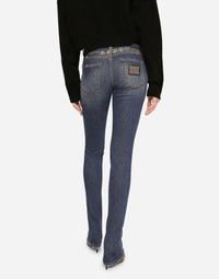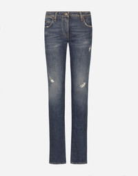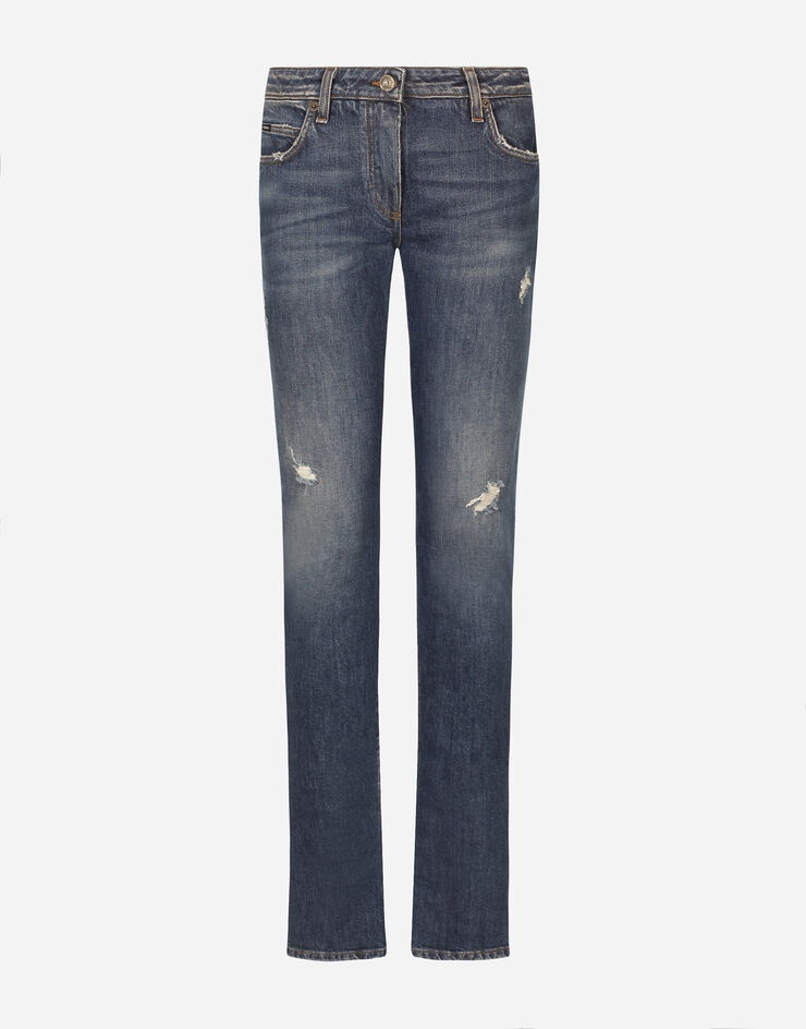 Bell-bottom denim jeans with rips: • Denim • Regular rise • 5 pockets • Branded label on the coin pocket • Branded metal and leather tag • Inner leg: 90 cm • Hem: 21.5 cm • Metal button with logo and zipper • The model is 175 cm tall and wears a size IT 40 • Made in Italy Care And Details External composition: 100% Cotton