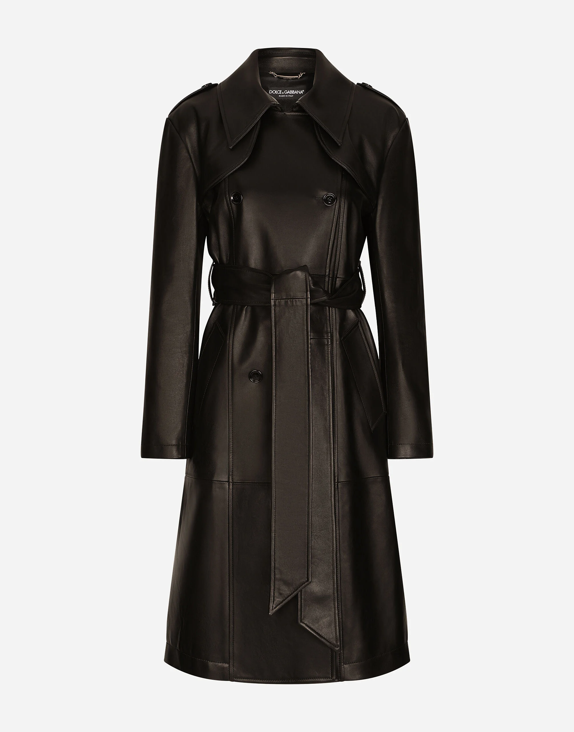 Belted double-breasted leather coat: • Shirt collar • Long sleeves • Vertical pockets • Leopard-print stretch satin lining • Leather belt and galalith button fastenings • The piece measures 105 cm from the rear collar seam on a size IT 40 • The model is 175 cm tall and wears a size IT 40 • Made in Italy Care And Details External composition: 100% Lambskin Internal composition: 97% Polyester 3% Spandex