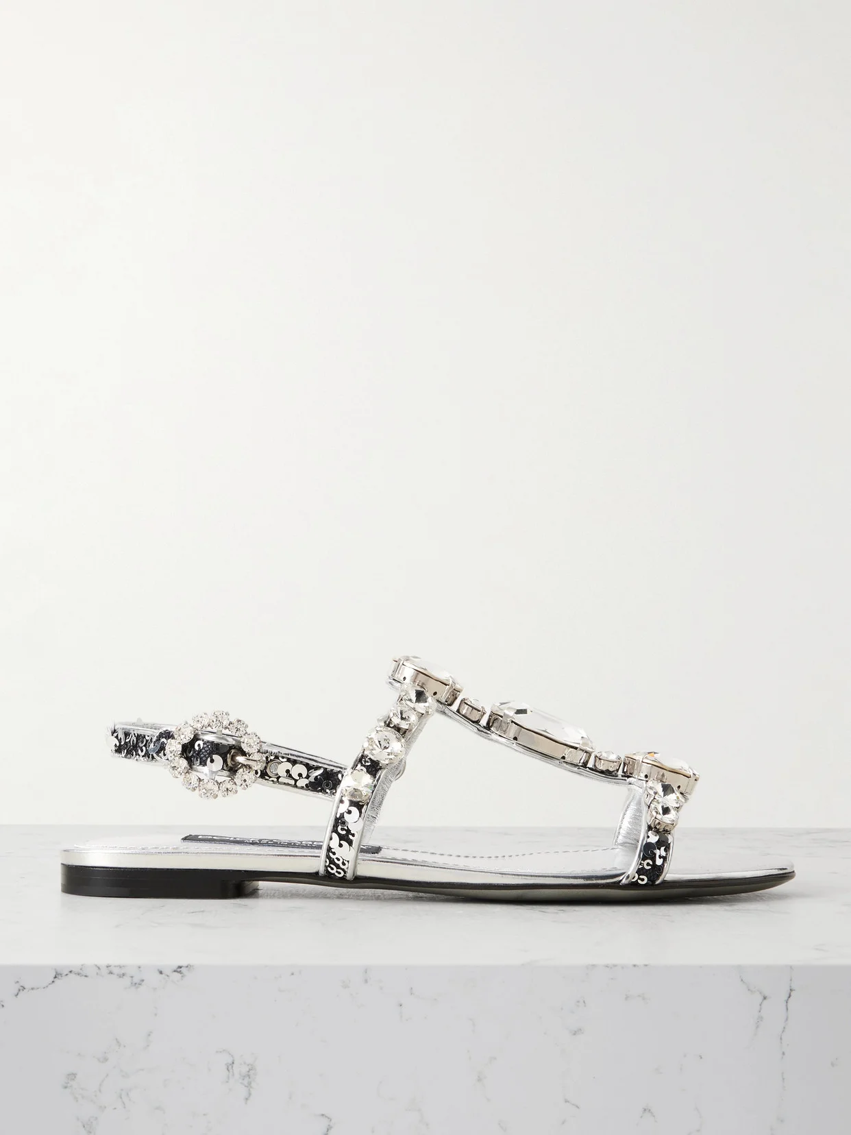 Dolce & Gabbana's 'Bianca' sandals will add a sparkling touch to your outfit. They're crafted from silver leather adorned with sequins and oversized crystals and set on slight heels.