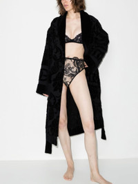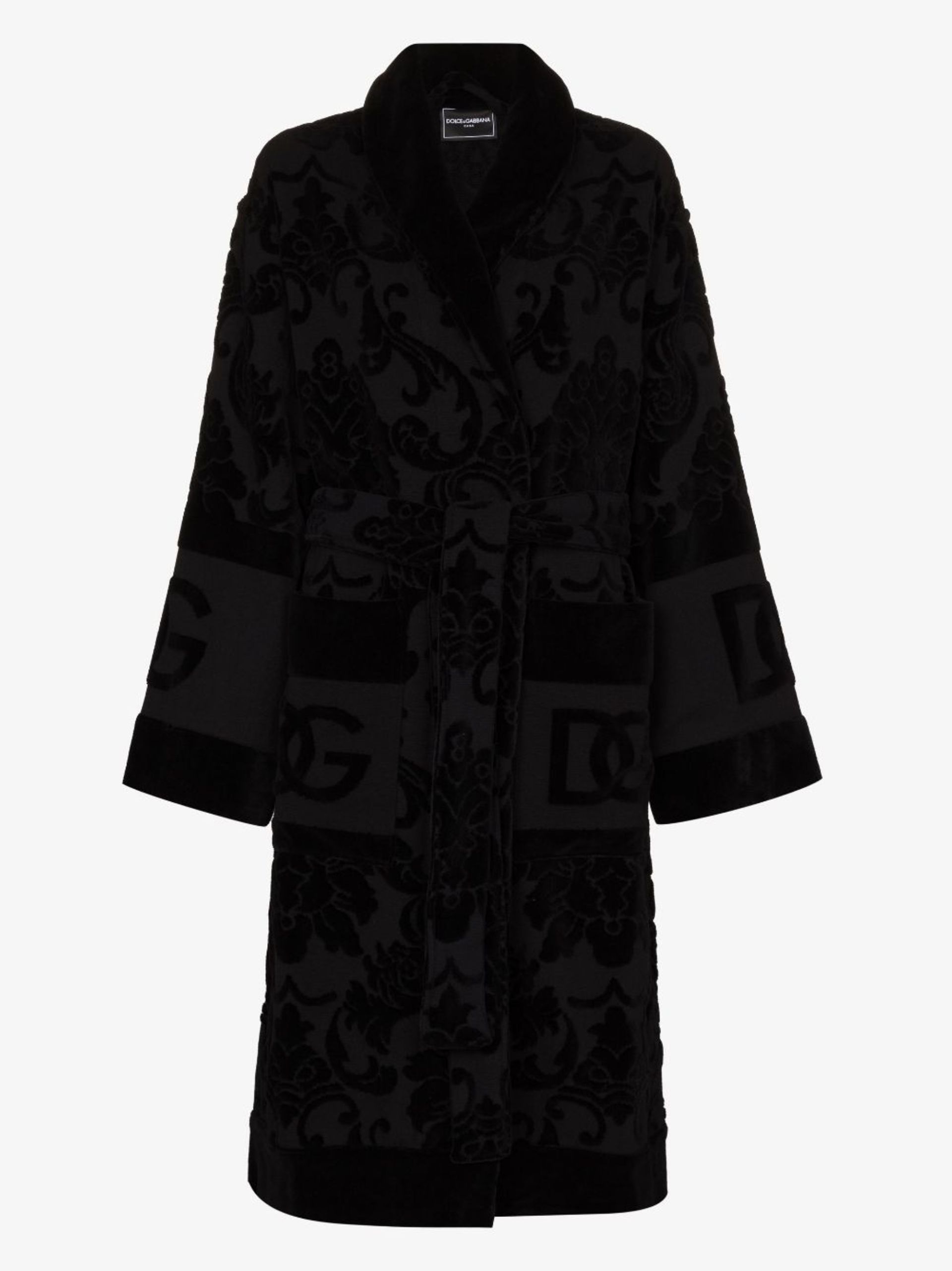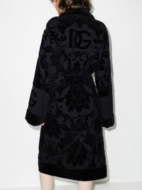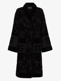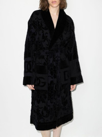 - This Dolce & Gabbana jacquard logo cotton bathrobe is shaped for a relaxed fit. It features an adjustable waist belt with all-over woven-in branding. Despite being a gown, this robe is apparently not suitable office attire. As such, we’re working from home this week. \ - Black - Made from cotton - Monogram embellishment - Shawl lapel - Long sleeves - Adjustable waist belt - Front pockets - Made in Italy Size & Fit - This piece fits true to size. We recommend you select your regular size - Cut for a relaxed fit. Comes with a belt for a flexible fit at the waist - Made with a mid-weight fabric - The model is 178 cm/ 5’10" and a size S; wears a size S Materials & Product Care Composition: Cotton 100%