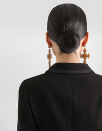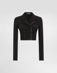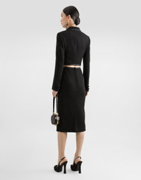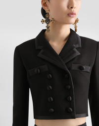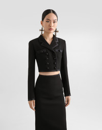 The Spring/Summer 2025 Women’s Collection is celebrating Italian beauty through bold and charismatic femininity. The 50s-inspired lingerie is the star, intermingling with fitted dresses, corsets and oversize trench coats. The iconic jackets have been updated with cropped cuts and modern inserts, while the floral prints add a romantic edge. The eveningwear shines with light fabrics and crystals, accompanied by look-defining accessories, from iconic bags to the cross earrings. Short double-breasted stretch wool crepe jacket with duchesse satin trims: • Black • Notched lapels • Long sleeves • Patch pockets • Tulle lining • Satin-covered button fastenings • The piece measures 40 cm from the rear collar seam on a size IT 40 • The model is 175 cm tall and wears a size IT 40 • Made in Italy External composition: 83% Virgin Wool 11% Silk 3% Polyester 2% Polyamide 1% Spandex Internal composition: 90% Polyamide 07% Acetate 03% Silk