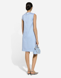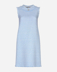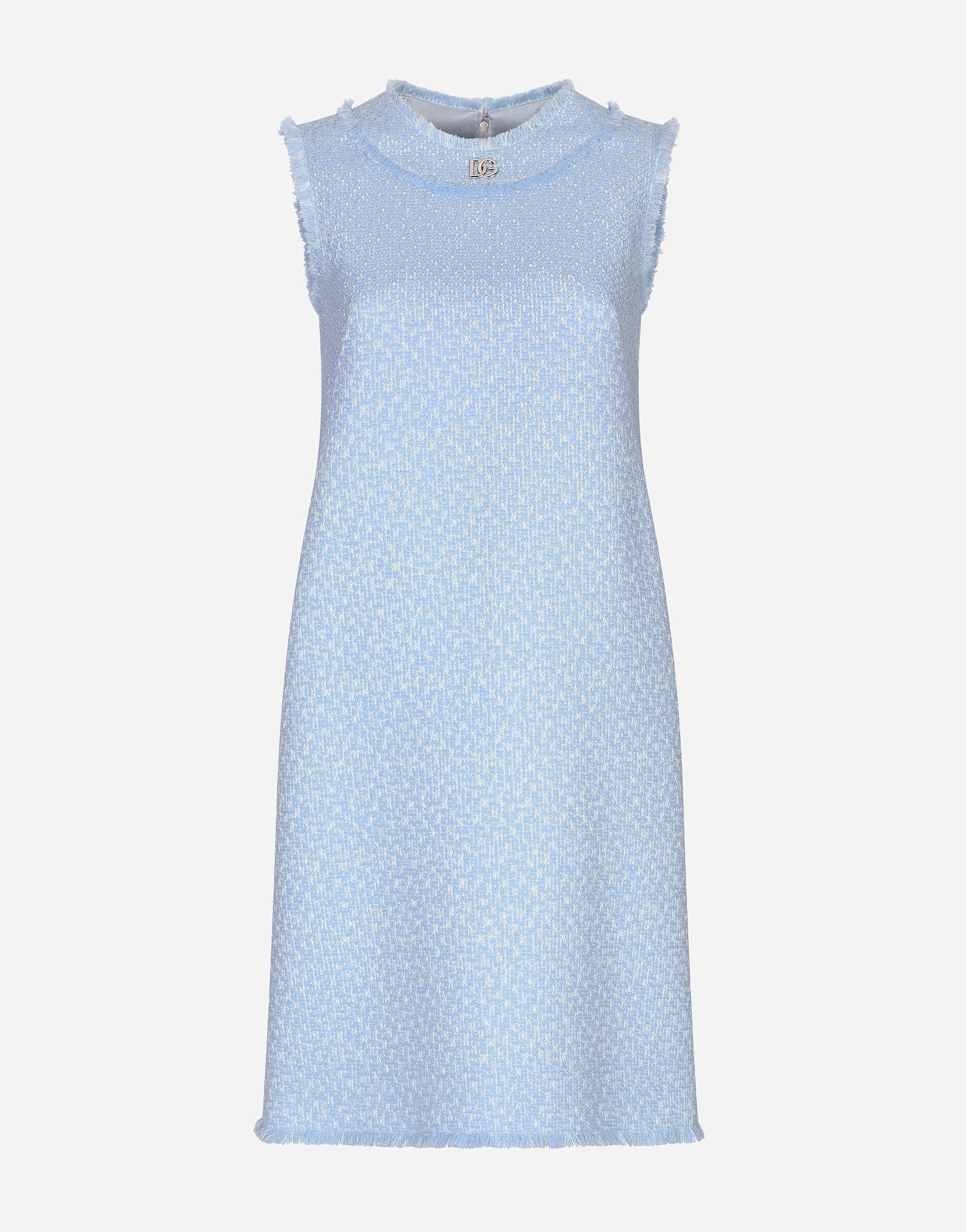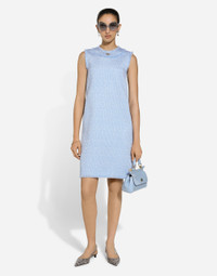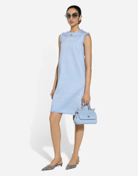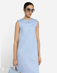In the FW 24/25 DNA Collection, the rules of classic tailoring have been reworked with an innovative feel. New raschel weave techniques feature on micro-jackets and coats, and original textures are woven on trench coats, skirts, jacquard suits and shirts. The color palette made up of Nero Sicilia black, Milky White and Ocean Blue is also original. The iconic bags in fine nappa leather and “Pyton FC Machine” finish off the looks. Sleeveless wool raschel tweed dress with DG logo: • Light blue • Round neck • Sleeveless • Sack fit • Tonal stretch silk satin lining • Rear zipper and hook-and-eye fastening • The piece measures 55 cm from the waist down on a size IT 40 • The model is 175 cm tall and wears a size IT 40 • Made in Italy External composition: 67% Virgin Wool 27% Viscose 06% Polyamide Internal composition: 92% Silk 08% Spandex