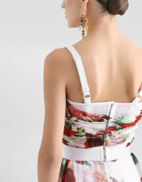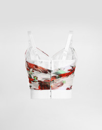 The Spring/Summer 2025 Women’s Collection is celebrating Italian beauty through bold and charismatic femininity. The 50s-inspired lingerie is the star, intermingling with fitted dresses, corsets and oversize trench coats. The iconic jackets have been updated with cropped cuts and modern inserts, while the floral prints add a romantic edge. The eveningwear shines with light fabrics and crystals, accompanied by look-defining accessories, from iconic bags to the cross earrings. Rose-print marquisette and chiffon corset top: • Multi-colored • Sweetheart neckline • Sleeveless with stretch straps • Lined • Elasticated marquisette on the back • Hook-and-eye fastening on the back • The model is 175 cm tall and wears a size IT 40 • Made in Italy The difference in the print placement that you may find on this product is a feature of Dolce&Gabbana’s “Handmade” pieces. A detail that makes every garment or accessory unique and exclusive. External composition: 50% Polyamide 20% Polyester 20% Silk 10% Spandex Internal composition: 100% Cotton
