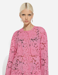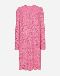 The DNA collection is distinguished by timeless shapes, bringing together three concepts: Sicilian flair, tailoring and sensuality. Nero Sicilia black and optical white predominate and pair with colors that catapult us onto the island of Sicily and make us dream. The designers channel the timeless wardrobe made up of creations that are instantly unmistakable in their simplicity, presenting us with sophisticated beauty loaded with meaning and symbolism that transcends fashion. Branded floral cordonetto lace coat: • Pink • Round neck • Long sleeves • Patch pockets • Tulle lining • Concealed press-stud fastenings • The piece measures 100 cm from the rear collar seam on a size IT 40 • The model is 175 cm tall and wears a size IT 40 • Made in Italy External composition: 43% Viscose 34% Cotton 23% Polyamide Internal composition: 100% Polyamide
