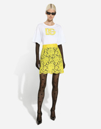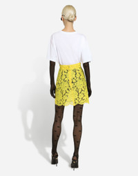 The DNA collection is distinguished by timeless shapes, bringing together three concepts: Sicilian flair, tailoring and sensuality. Nero Sicilia black and optical white predominate and pair with colors that catapult us onto the island of Sicily and make us dream. The designers channel the timeless wardrobe made up of creations that are instantly unmistakable in their simplicity, presenting us with sophisticated beauty loaded with meaning and symbolism that transcends fashion. Branded floral cordonetto lace miniskirt: • Yellow • High-waisted • Stretch silk crepe de chine underskirt • Rear zipper and hook-and-eye fastening • The piece measures 45 cm from the waist down on a size IT 40 • The model is 175 cm tall and wears a size IT 40 • Made in Italy External composition: 43% Viscose 34% Cotton 23% Polyamide Internal composition: 91% Silk 9% Spandex