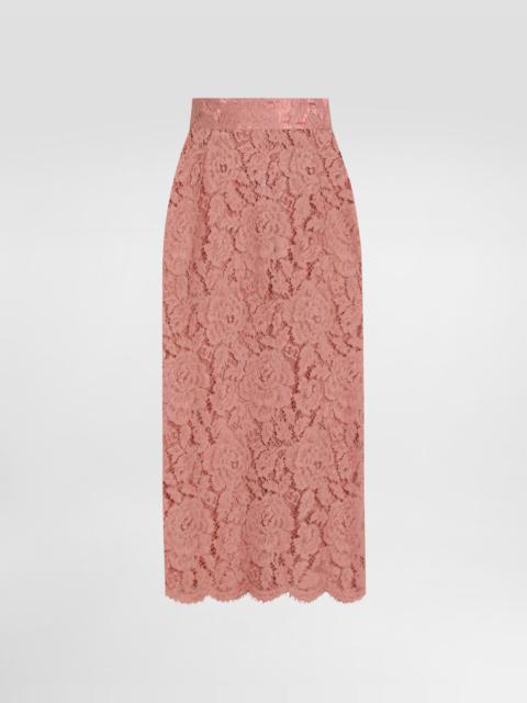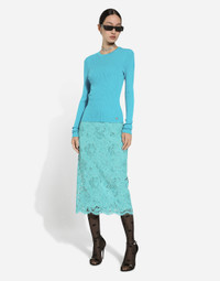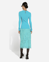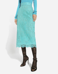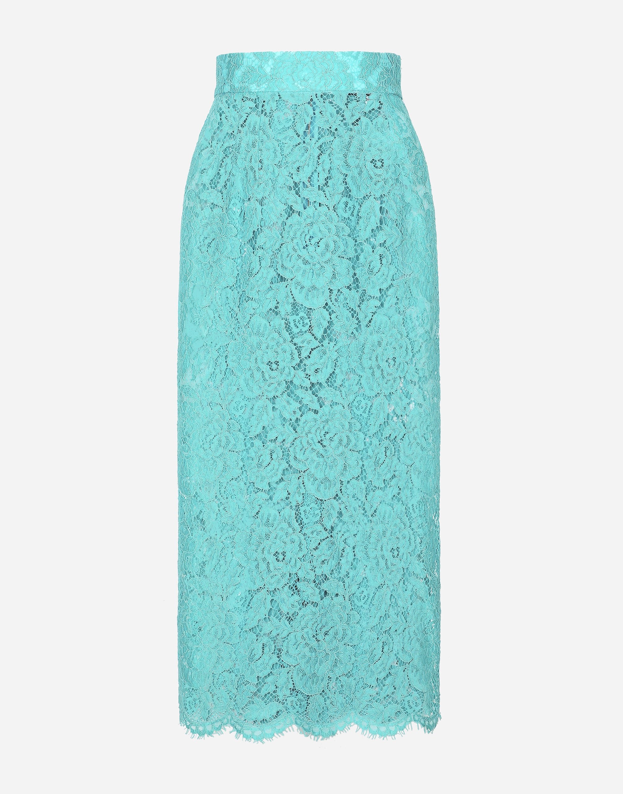 The DNA collection is distinguished by timeless shapes, bringing together three concepts: Sicilian flair, tailoring and sensuality. Nero Sicilia black and optical white predominate and pair with colors that catapult us onto the island of Sicily and make us dream. The designers channel the timeless wardrobe made up of creations that are instantly unmistakable in their simplicity, presenting us with sophisticated beauty loaded with meaning and symbolism that transcends fashion. Branded floral cordonetto lace pencil skirt: • Turquoise • High-waisted • Stretch silk crepe de chine underskirt • Rear zipper and hook-and-eye fastening • The piece measures 75 cm from the waist down on a size IT 40 • The model is 175 cm tall and wears a size IT 40 • Made in Italy External composition: 43% Viscose 34% Cotton 23% Polyamide Internal composition: 91% Silk 9% Spandex