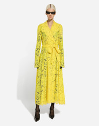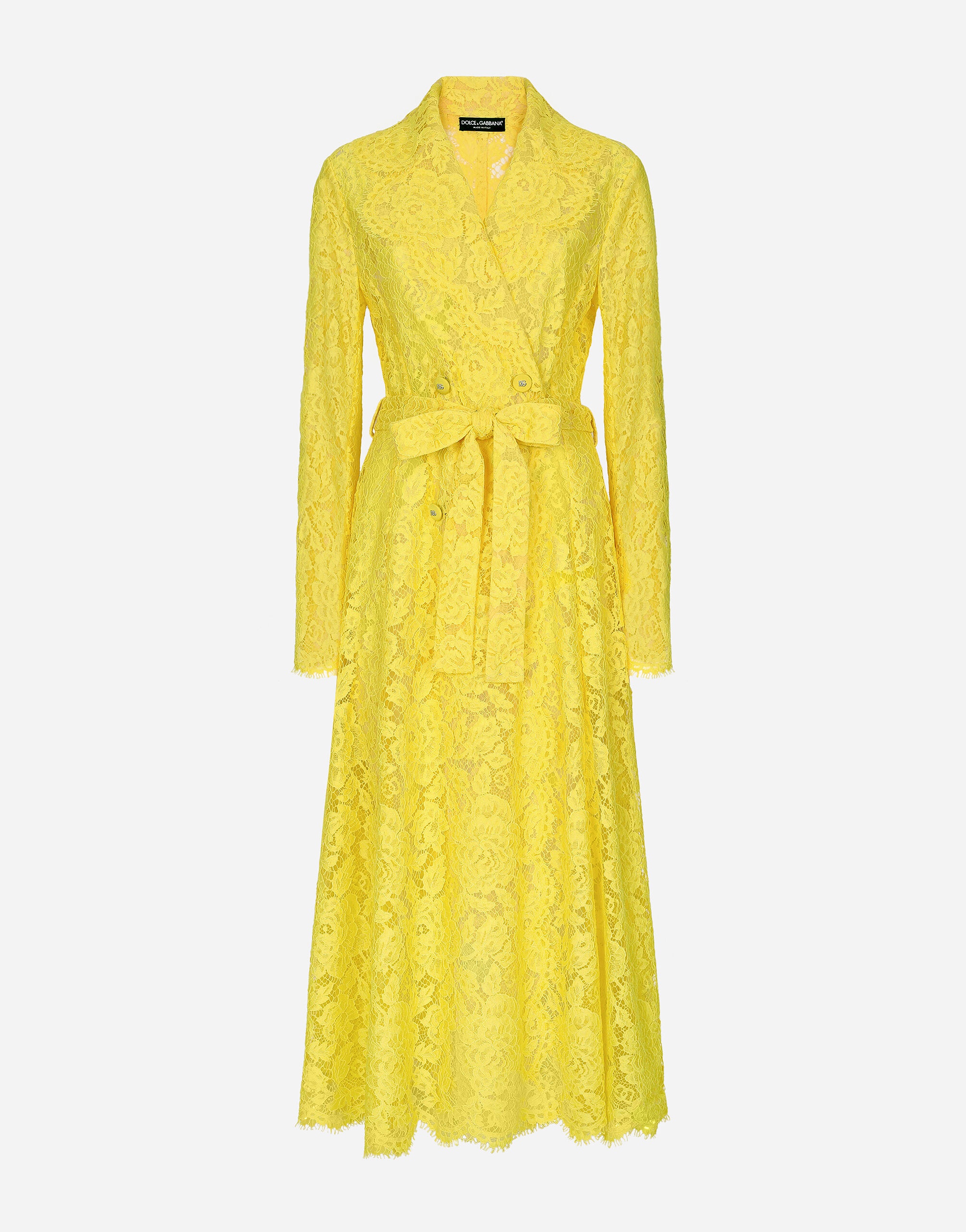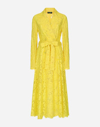 The DNA collection is distinguished by timeless shapes, bringing together three concepts: Sicilian flair, tailoring and sensuality. Nero Sicilia black and optical white predominate and pair with colors that catapult us onto the island of Sicily and make us dream. The designers channel the timeless wardrobe made up of creations that are instantly unmistakable in their simplicity, presenting us with sophisticated beauty loaded with meaning and symbolism that transcends fashion. Branded floral cordonetto lace trench coat: • Yellow • Notched lapel collar • Long sleeves • Pockets • Tulle lining • Belt loops • Press-stud button fastenings and belt • The piece measures 130 cm from the rear collar seam on a size IT 40 • The model is 175 cm tall and wears a size IT 40 • Made in Italy External composition: 43% Viscose 34% Cotton 23% Polyamide Internal composition: 100% Polyamide