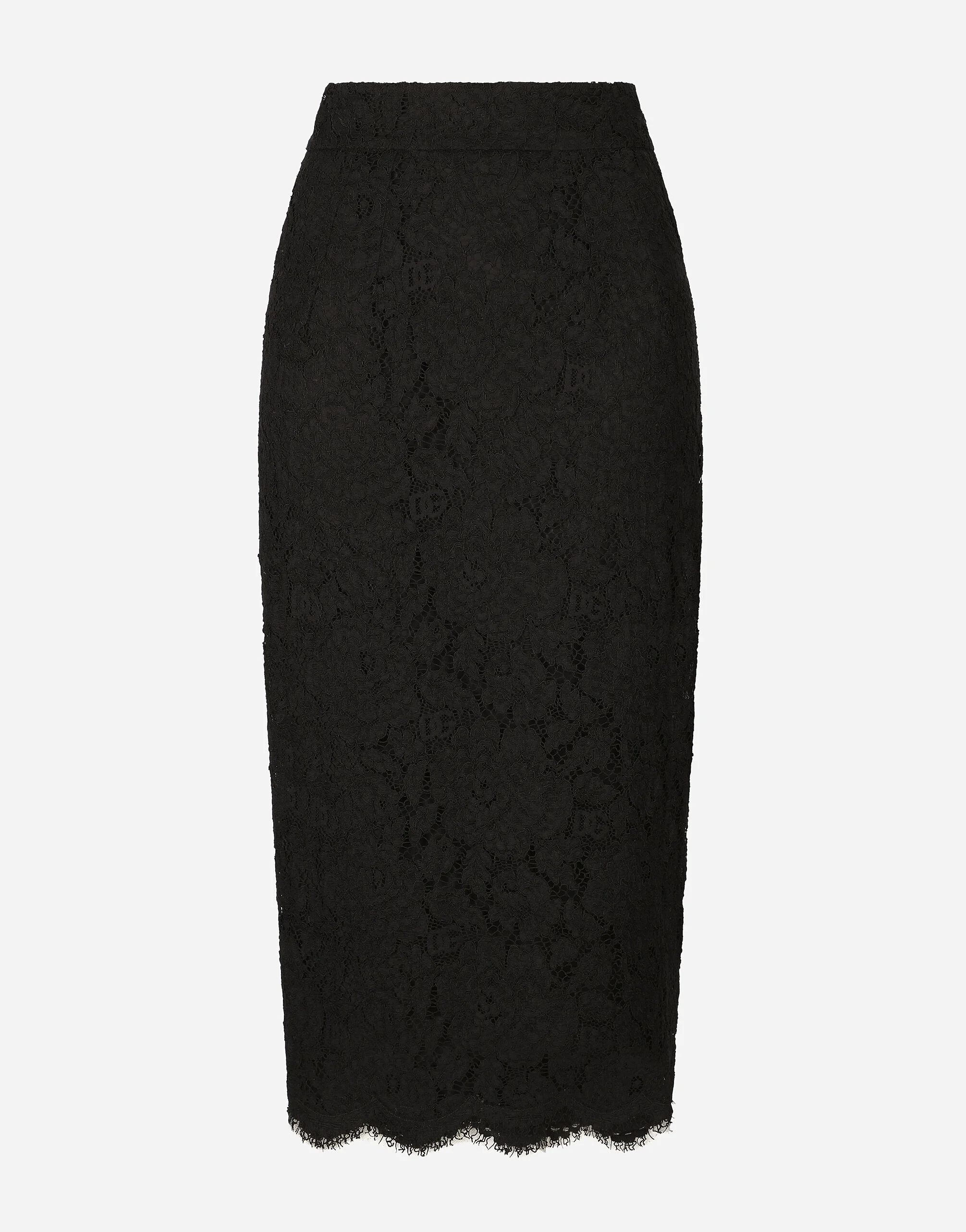 Dolce&Gabbana is creating a new DNA collection, using its style with a new concept of everyday elegance and apparel. Timeless, contemporary and traditional style. Lace is updated to become stretchy and embellished by the DG logo, making the garments feminine statement pieces that are full of character. Branded stretch lace midi skirt: • High-waisted • Stretch silk crepe de chine underskirt • Rear zipper and hook-and-eye fastening • The piece measures 75 cm from the waist down on a size IT 40 • The model is 175 cm tall and wears a size IT 40 • Made in Italy External composition: 51% Viscose 24% Cotton 20% Polyamide 5% Spandex Internal composition: 91% Silk 9% Spandex