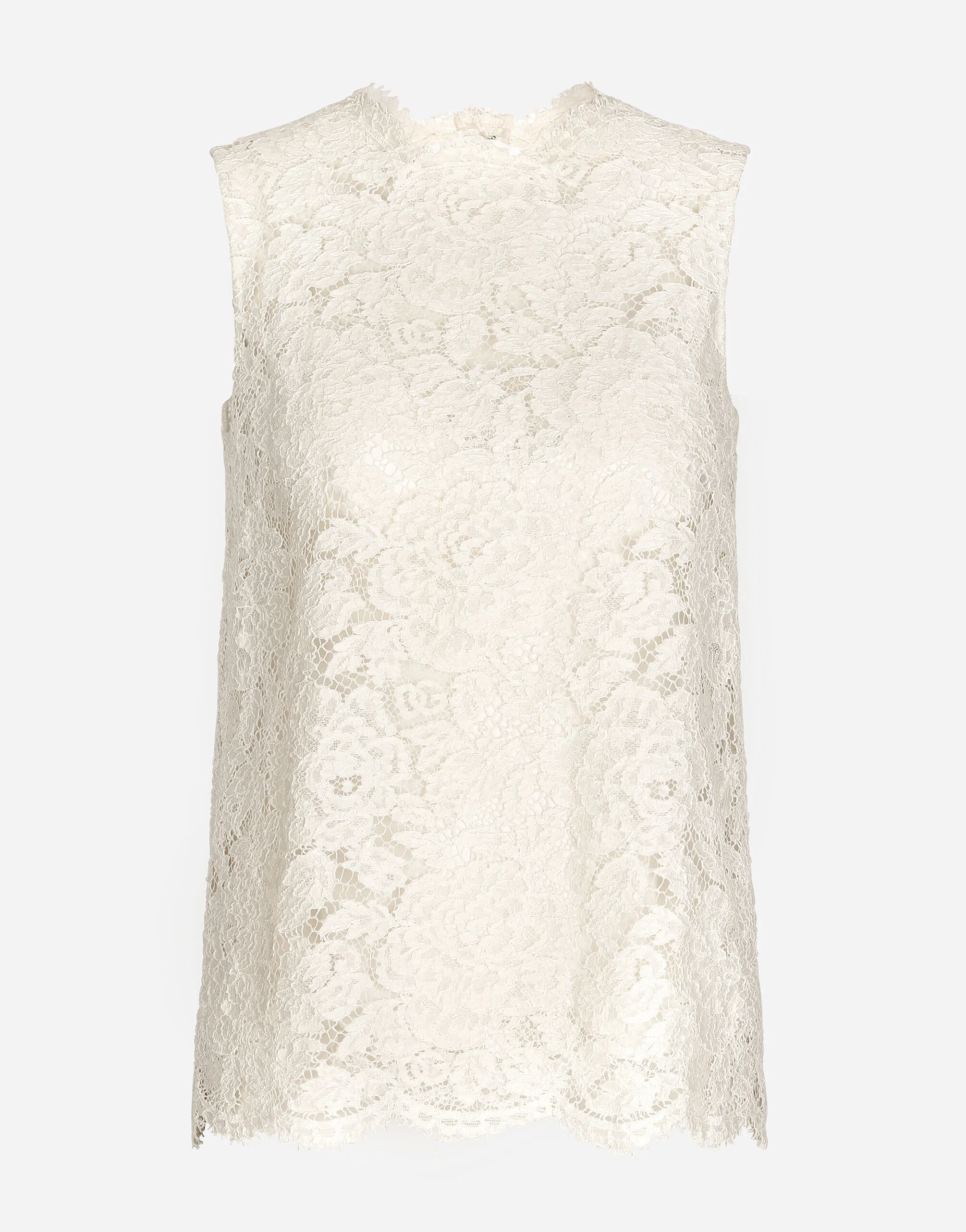 Branded stretch lace top: • Round neck • Sleeveless • Regular fit • Stretch silk crepe de chine top • Zipper fastening at the back • The piece measures 62 cm from the center back on a size IT 40 • The model is 175 cm tall and wears a size IT 40 • Made in Italy Care And Details External composition: 51% Viscose 24% Cotton 20% Polyamide 5% Spandex Internal composition: 91% Silk 9% Spandex