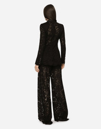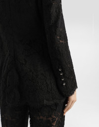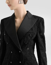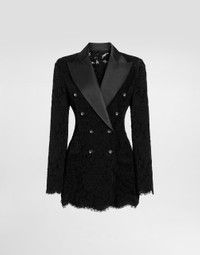 Branded stretch lace Turlington blazer: • Silk satin peak lapels • Long sleeves • Silk satin flap pockets • Tulle lining • Canneté-covered button fastenings and DG logo • The piece measures 70.5 cm from the rear collar seam on a size IT 40 • The model is 175 cm tall and wears a size IT 40 • Made in Italy Care And Details External composition: 41% Viscose 19% Cotton 16% Polyamide 16% Silk 4% Spandex 4% Polyester Internal composition: 90% Polyamide 10% Silk