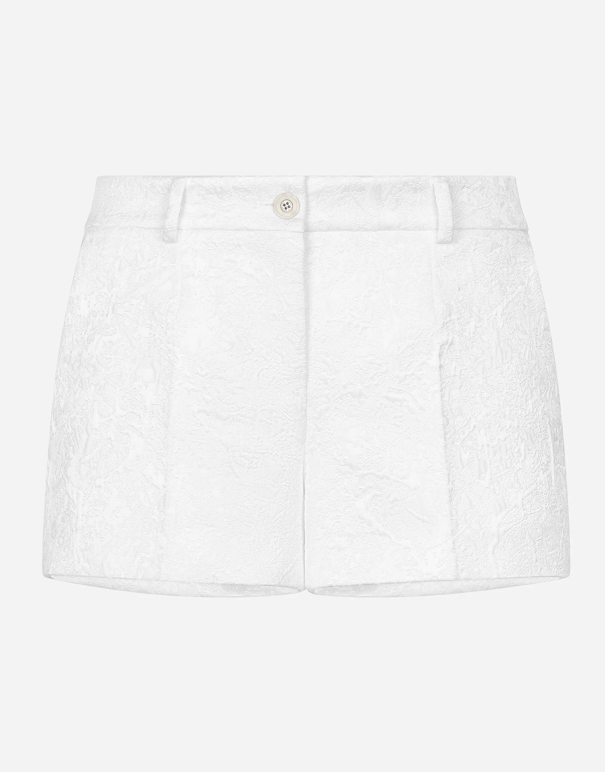 The Italian summers of the 1960s, the candid purity of white, the sophisticated elegance of the jet set of that era. The imagery of the FW24/25 Capri Collection encapsulates all this flawlessly. The pieces range from floaty poplin silhouettes or sack-style dresses and skirts, to brocade outerwear and floral-inlay fabric shirts. The iconic bags – the Logo Bag, the Sicily Bag and the Dolce Box – complement the looks, while the shoes come embroidered with designs inspired by the crystal-clear sea of Capri. Brocade shorts: • White • Regular rise • Slant pockets • Inner leg: 6.5 cm • Hem: 33 cm • Zipper and button fastening • The model is 175 cm tall and wears a size IT 40 • Made in Italy External composition: 64% Cotton 36% Viscose