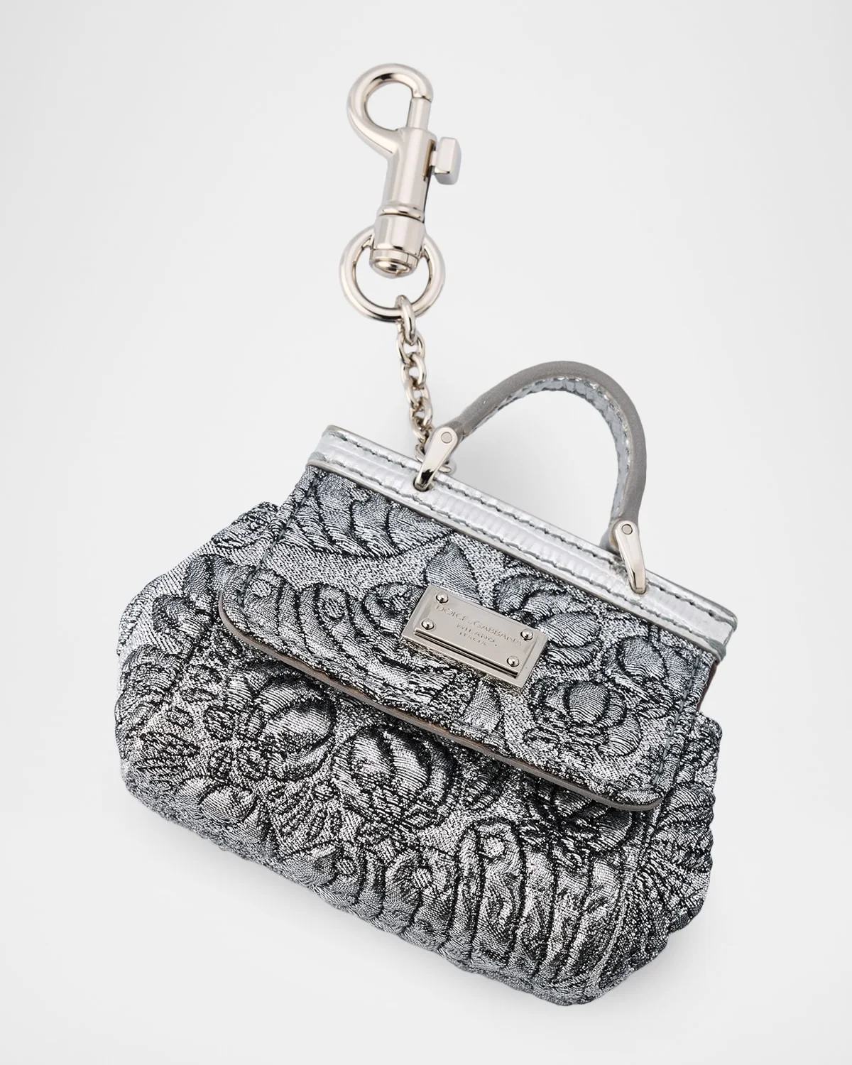 Stylish and functional, this bag charm by Dolceamp;Gabbana is crafted from silver brocade with palladiumplated hardware Designed to hold AirPods and attach to any bag Top handle Flap top with snap closure Lobster clasp Approx. 2.8"H x 3.1"W x 1.8"D Made in Italy