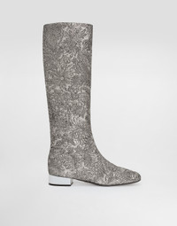Elegance, tailored lines and sparkling details define the Dolce&Gabbana Holiday collection. Sixties inspirations blend with a contemporary aesthetic. For him, structured jackets and cuts that enhance the silhouette for her, silver brocade and crystals illuminate festive looks. Each piece stands out for its fine materials, attention to detail and distinctive style. These brocade boots are a must-have for those looking for timeless elegance and style. Perfect for formal occasions, this boot stands out for its craftsmanship and the use of fine materials. Brocade fabric boots: • Silver • Jackie New shape • Leather outsole with DG metal logo • Leather heel insole customized with label • Palladium plating • Item equipped with black cotton bag and black embossed box • Heel height 30 mm • Made in Italy External composition: 33% Metallic Polyester, 32% Acrylic, 16% Virgin Wool, 13% Silk, 6% Polyamide Internal composition: 55% Lambskin, 45% Goatskin