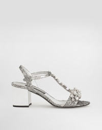 Elegance, tailored lines and sparkling details define the Dolce&Gabbana Holiday collection. Sixties inspirations blend with a contemporary aesthetic. For him, structured jackets and cuts that enhance the silhouette for her, silver brocade and crystals illuminate festive looks. Each piece stands out for its fine materials, attention to detail and distinctive style. This formal sandal stands out for its embroidered details and brocade elegance, perfect for adding a precious touch to your look. Brocade sandals with stones embroidery: • Multi-colored • Keira shape • Outsole leather • Leather open toe insole customized with label • Customization with buckle • Palladium plating • Item equipped with black cotton bag and black embossed box • Heel height 60 mm • Made in Italy External composition: 31% Acrylic, 31% Metallic Polyester, 22% Virgin Wool, 11% Silk, 5% Polyamide Internal composition: 50% Lambskin, 29% Goatskin, 7% Acrylic, 7% Metallic Polyester, 3% Silk, 3% Virgin Wool, 1% Polyamide
