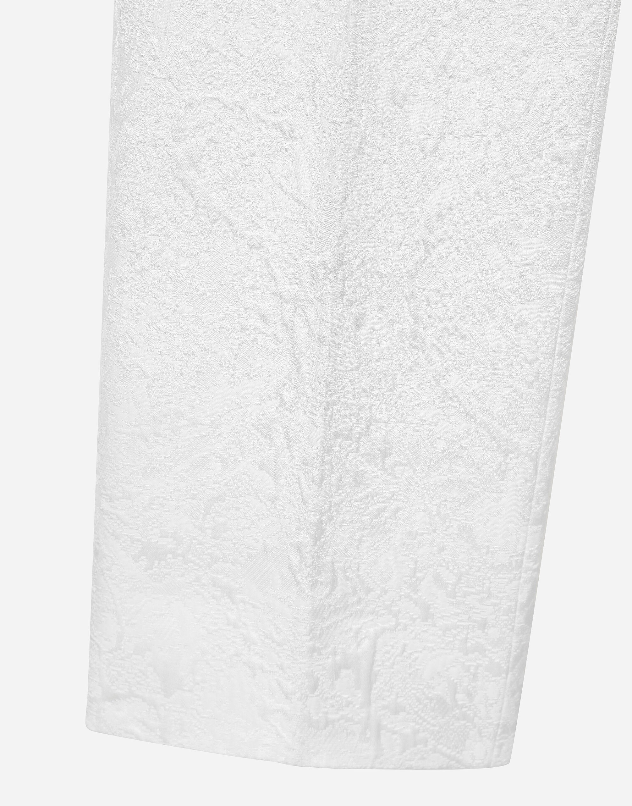 The Italian summers of the 1960s, the candid purity of white, the sophisticated elegance of the jet set of that era. The imagery of the FW24/25 Capri Collection encapsulates all this flawlessly. The pieces range from floaty poplin silhouettes or sack-style dresses and skirts, to brocade outerwear and floral-inlay fabric shirts. The iconic bags – the Logo Bag, the Sicily Bag and the Dolce Box – complement the looks, while the shoes come embroidered with designs inspired by the crystal-clear sea of Capri. Cotton brocade cigarette pants: • White • High-waisted • Slant pockets • Inner leg: 74 cm • Hem: 17 cm • Zipper and button fastening • The model is 175 cm tall and wears a size IT 40 • Made in Italy External composition: 64% Cotton 36% Viscose