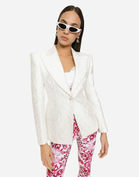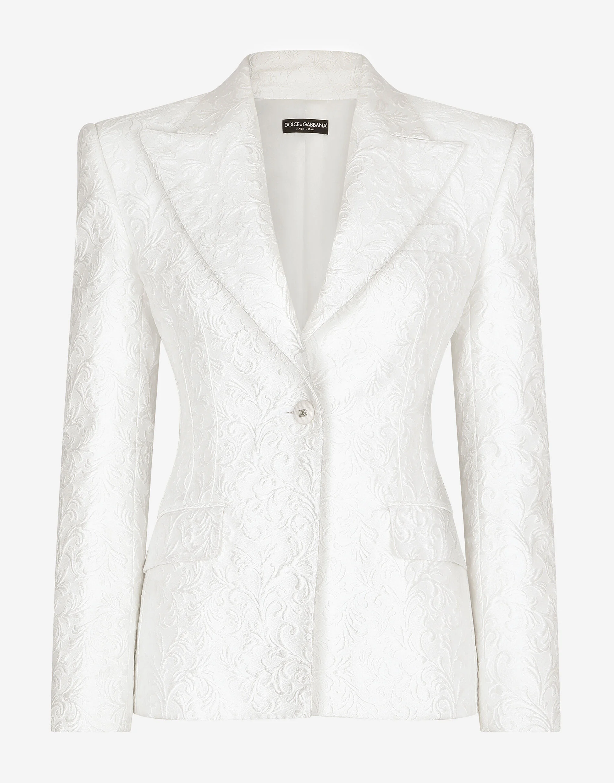 Brocade Turlington blazer: • White • Single-breasted • Peak lapels • Long sleeves • Flap pockets • Stretch silk satin lining • Canneté-covered button fastening and DG logo • The piece measures 70 cm from the rear collar seam on a size IT 40 • The model is 175 cm tall and wears a size IT 40 • Made in Italy Care And Details External composition: 67% Polyester 25% Polyamide 8% Silk