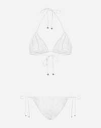 The Dolce&Gabbana beachwear collection is filled with unique pieces boasting great femininity and sensuality. Contemporary pieces with original and exclusive details and silhouettes complete the range together with classic iconic garments. Broderie anglaise triangle bikini: • White • Adjustable triangle bikini top with ties on the neck and back and DG logo hook. • Thong bikini bottoms • Branded DG logo in nickel-free metal • Matching PVC pouch • Made in Italy External composition: 50% Polyamide 33% Polyester 17% Spandex Internal composition: 88% Polyamide 12% Spandex