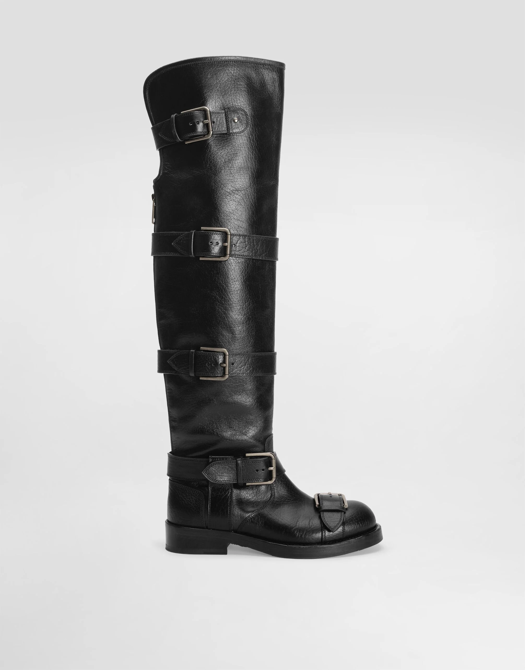 In the Fall/Winter 2025 Fashion Show Collection, shearling jackets, in fur-free versions, reveal slip dresses and create contrast' plays while denim welcomes fabric or Leo print inserts. Sweatshirts are the result of long experimentation with volumes. Evening looks become precious thanks to dresses with special embroideries and luminous touches of sequins and crystals. Sheepskin inserts also unite hats, shoes, and bags, including those with pockets. This boot embodies casual elegance, perfect for those looking for a sophisticated and timeless style. Horse Leather boots: • Black • Bernini shape • Leather and TPU outsole • Leather heel cup insole with label • With buckles • Miami palladium plating • Item equipped with black Cotton bag and black embossed box • Heel height 20 mm • Made in Italy External Composition: 100% Horse Leather Internal Composition: 94% Calfskin, 6% Goatskin