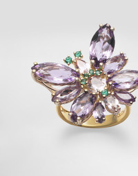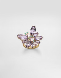 The ring stands out for the elegant butterfly that has wings made of amethysts and a central body and antennas made of morganites and emeralds. The gems, which harmonize together to create a wonderful color combination, are set in precious mountings with wire claws. Inside the ring, the DOLCE&GABBANA logo is engraved. Technical features: 18K gold (750/000).Gems: 8 marquise-cut amethyst quartz, approx. 5.30 ct3 beryl gemstones, morganite variety in pear and oval cuts, approx. 0.80 ct; 7 brilliant-cut emeralds.Made in Italy Yellow gold 750/000