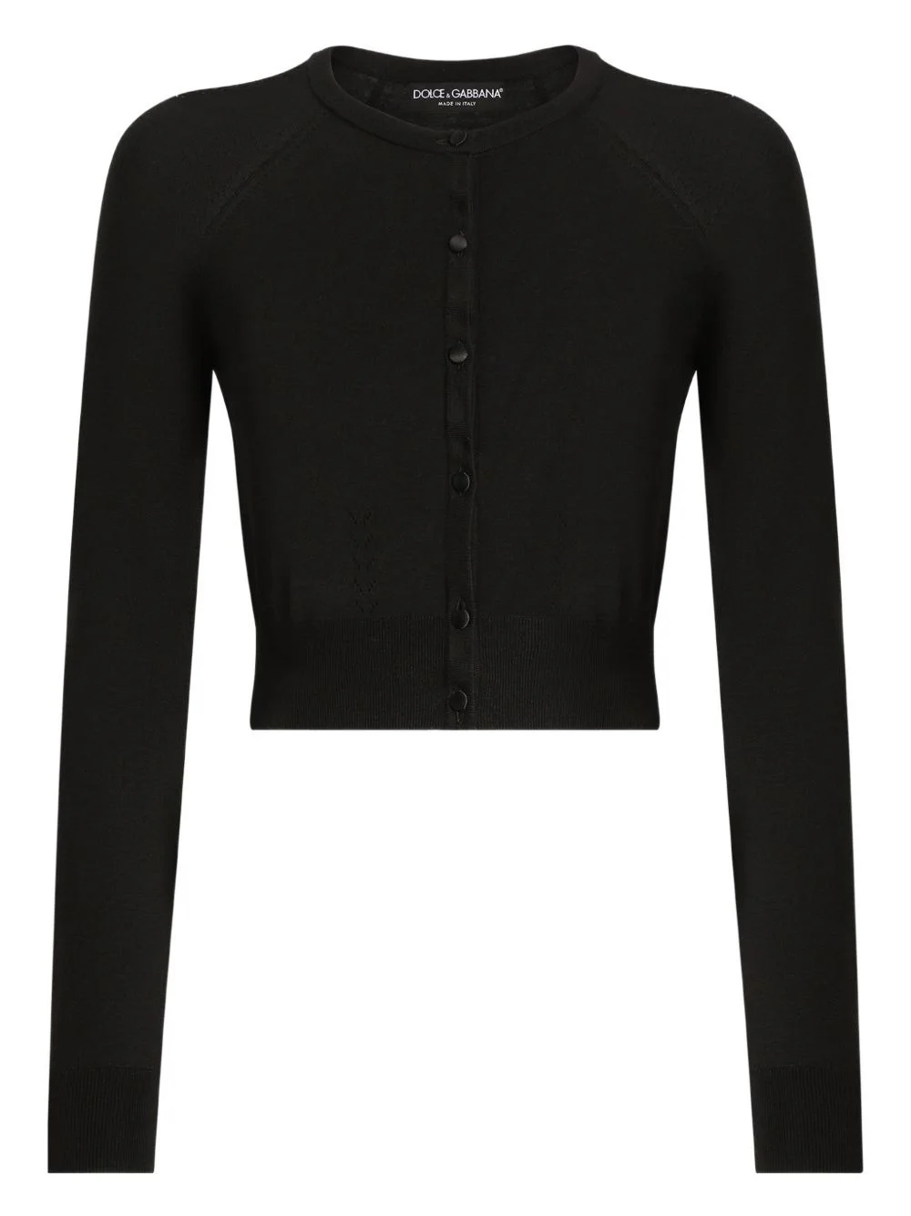 button-up cropped cardigan Highlights - Black - Long sleeves - Ribbed detailing - Button fastening - Round neckline Made in Italy Composition Virgin Wool 60%, Silk 26%, Polyamide 13%, Elastane 1% Washing instructions Read Manufacturer Guidelines