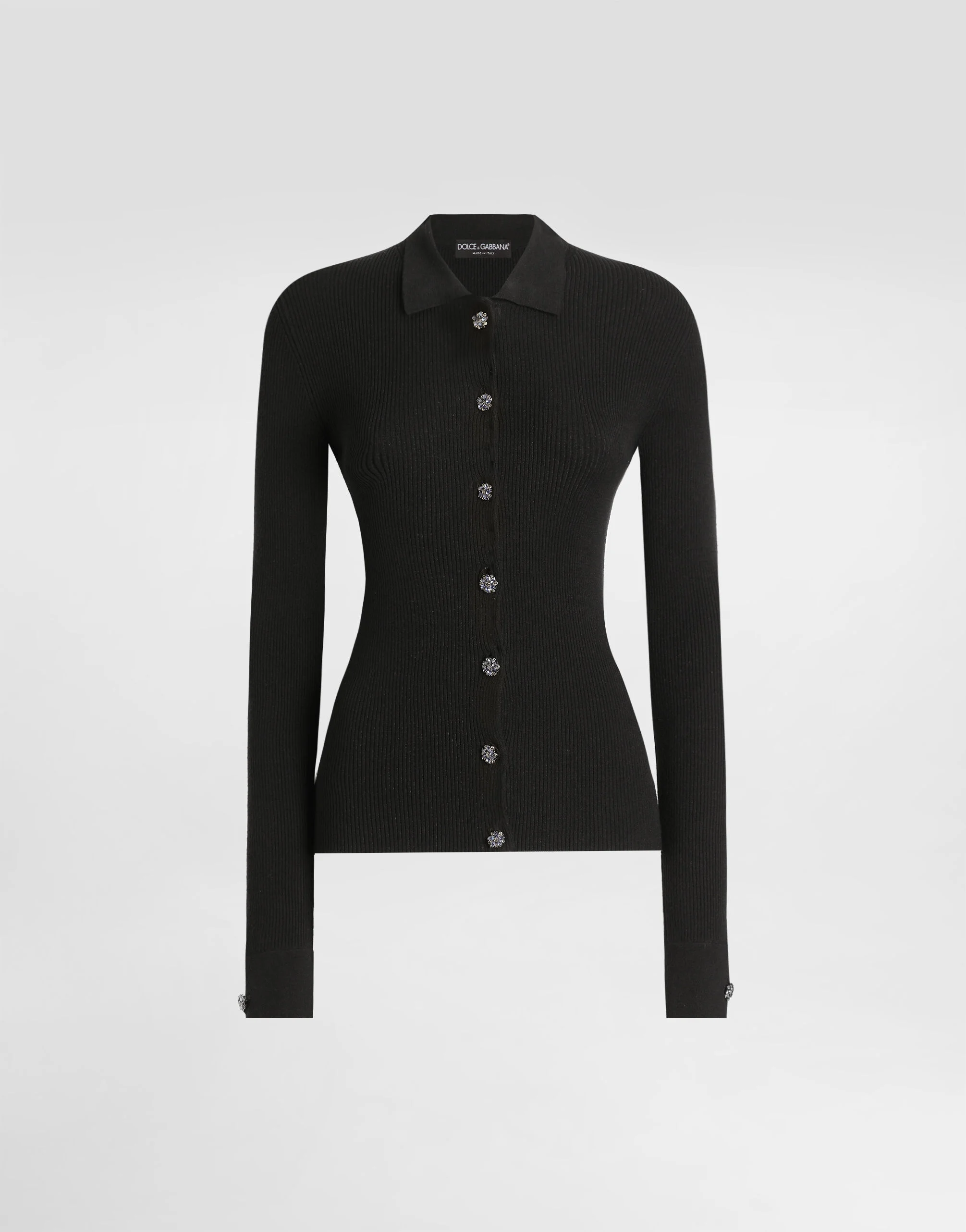 This black cardigan with buttons is an essential piece for any woman's wardrobe. Made with a fine rib knit, it offers a touch of elegance and comfort for any occasion. Ribbed cardigan: • Black • Front buttons • Long sleeves • Length from shoulder 60 cm on size 40 IT • The model is 175 cm tall and wears size 40 IT • Made in Italy External Composition: 72% Viscose, 28% Polyester