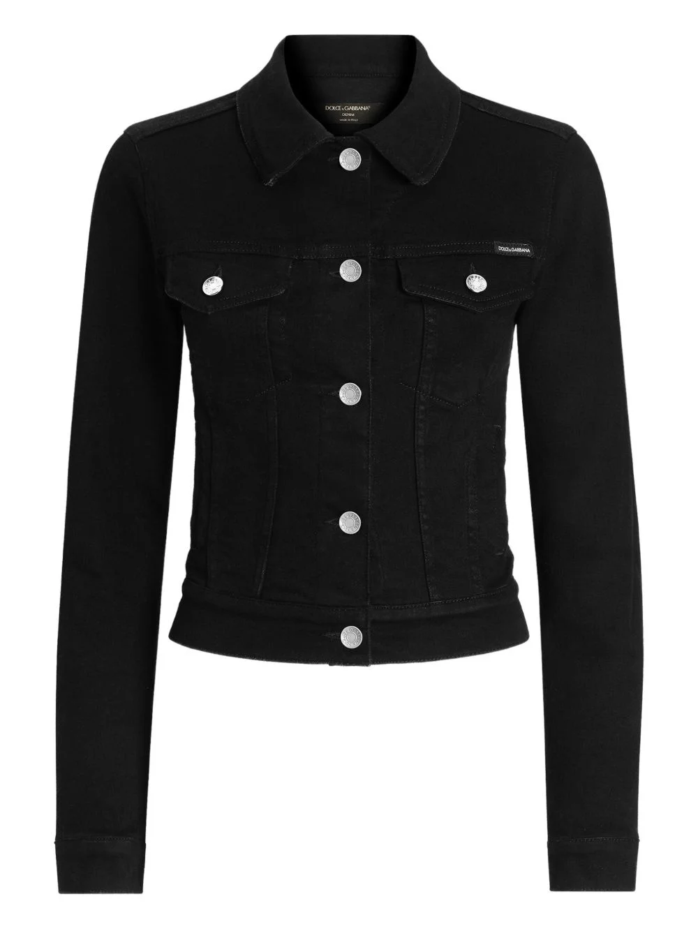 buttoned denim jacket Highlights - Black - Button fastening - Chest pockets - Silver-tone logo plaque - Point collar - Long sleeves Made in Italy Composition Cotton 99%, Elastane 1% Washing instructions Read Manufacturer Guidelines