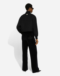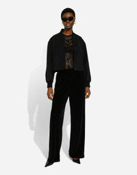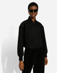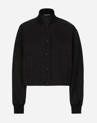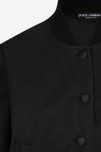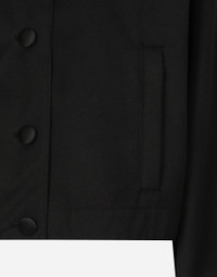Inspired by 80s fashion photography, the Black Sicily collection masterfully blends masculine and feminine elements, pairing tailored cuts and corset details for the FW 24/25 season. A new vision of the iconic Nero Sicilia black is conveyed through contemporary and sensual looks: jackets and skirts in all-over glen plaid pair with openwork socks, while the 50s-inspired Mun shoes with Eva heel go with the houndstooth Sicily bag featuring crocodile-print leather inserts. Gabardine bomber jacket, waxed on reverse, with branded tag: • Tubular knit collar • Long sleeves with stretch knit cuffs • Pockets • Regular fit • Unlined • Satin-covered button fastenings • The piece measures 50 cm from the center back on a size IT 40 • The model is 175 cm tall and wears a size IT 40 • Made in Italy External composition: 65% Polyester 35% Cotton