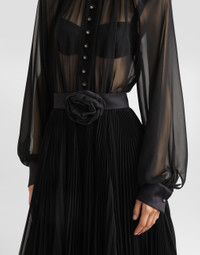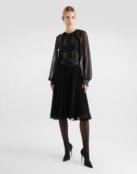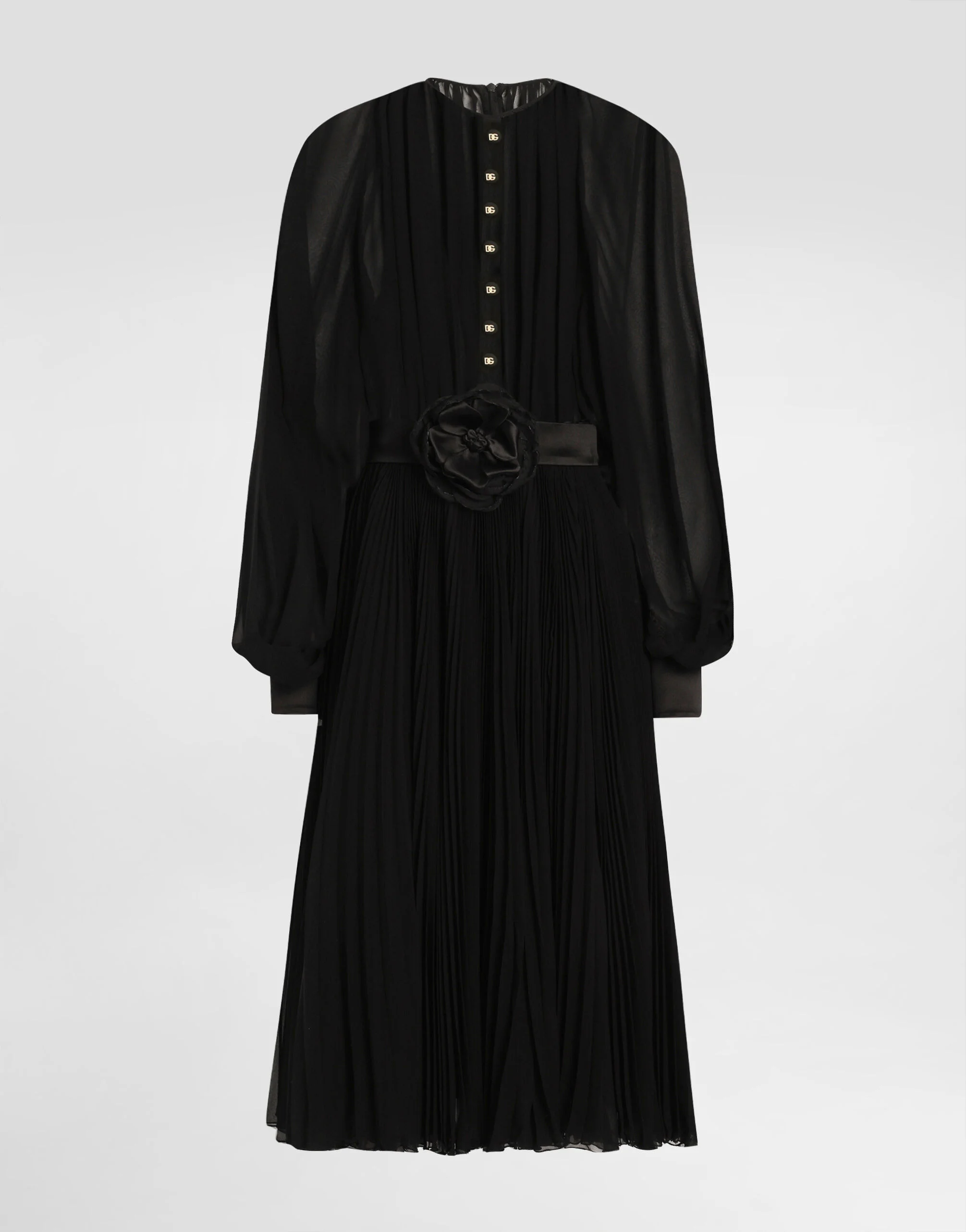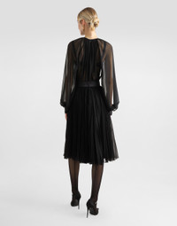 The Women's Black Sicily Collection reinforces Dolce&Gabbana's iconic fabrics and codes rooted in Italian heritage. Sensual silhouettes, highlighted by floral prints and refined corsetry, evoke an intriguing elegance, while the iconic black lace, satin, and velvet dominate the collection. Denim in various shades of blue introduces a contemporary twist, balancing the classic and modern. Embroidered crosses, medals, and jewelry add a sophisticated touch. Calf-length babydoll dress with pleated skirt: • Black • Round neck • Long raglan sleeves with silk cuffs • Satin belt with bow detail • Stretch silk crepe de chine slip dress • Rear zipper and hook-and-bar fastening • The piece measures 70 cm from the waist down on a size IT 40 • The model is 175 cm tall and wears a size IT 40 • Made in Italy External composition: 85% Polyester 15% Silk Internal composition: 91% Silk 09% Spandex