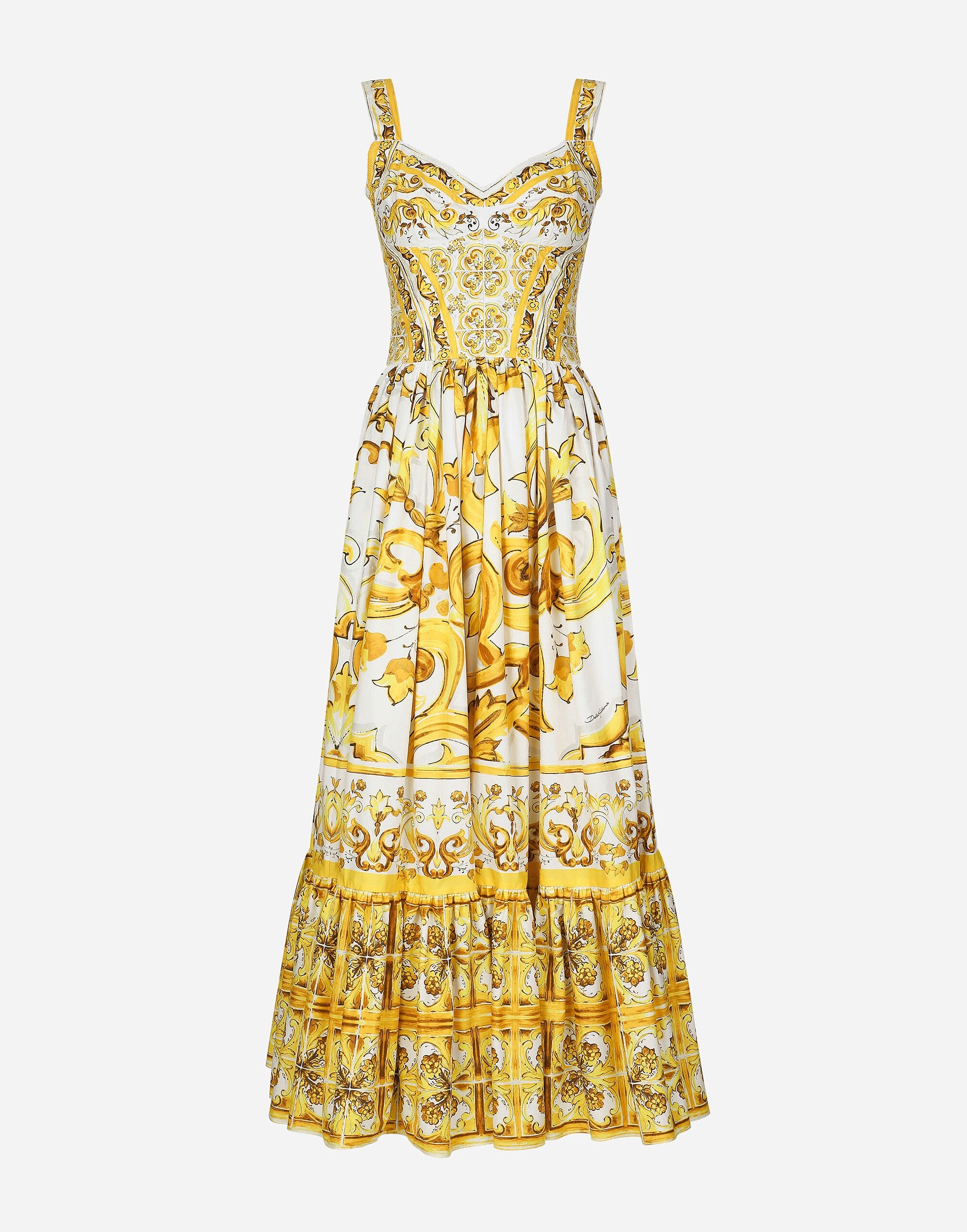 The Majolica, a symbol of Italian craftsmanship, comes in lemon yellow for the FW24/25 Collection. This vibrant hue, brightened up by pure white, evokes summer light dancing on the quintessential Sicilian homes that look out to the sea. Evocative color detailing gives the brand’s iconic pieces and accessories a bold edge, which is extraordinarily feminine and vibrant. A tribute to the majolica art that, once again, enhances Dolce&Gabbana’s signature aesthetic. Calf-length corset dress in cotton poplin with majolica print: • Yellow and White • Sweetheart neckline with knot detail • Sleeveless with shoulder straps • Stretch smock-stitch back • Partially lined in cotton poplin • Rear zipper and hook-and-eye fastening • The piece measures 95 cm from the waist down on a size IT 40 • The model is 175 cm tall and wears a size IT 40 • Made in Italy External composition: 100% Cotton Internal composition: 100% Cotton