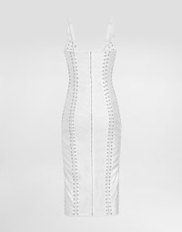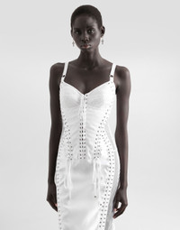 The Spring/Summer 2025 Women’s Collection is celebrating Italian beauty through bold and charismatic femininity. The 50s-inspired lingerie is the star, intermingling with fitted dresses, corsets and oversize trench coats. The iconic jackets have been updated with cropped cuts and modern inserts, while the floral prints add a romantic edge. The eveningwear shines with light fabrics and crystals, accompanied by look-defining accessories, from iconic bags to the cross earrings. Calf-length dress with corset detailing, lacing and eyelets: • White • Sweetheart neckline • Sleeveless with adjustable stretch straps • Stretch center back • Lined • Full-length hook-and-eye fastening on the back • The piece measures 75 cm from the waist down on a size IT 40 • The model is 175 cm tall and wears a size IT 40 • Made in Italy External composition: 55% Polyester 33% Polyamide 7% Spandex 5% Silk Internal composition: 60% Cotton 22% Polyamide 9% Spandex 9% Silk