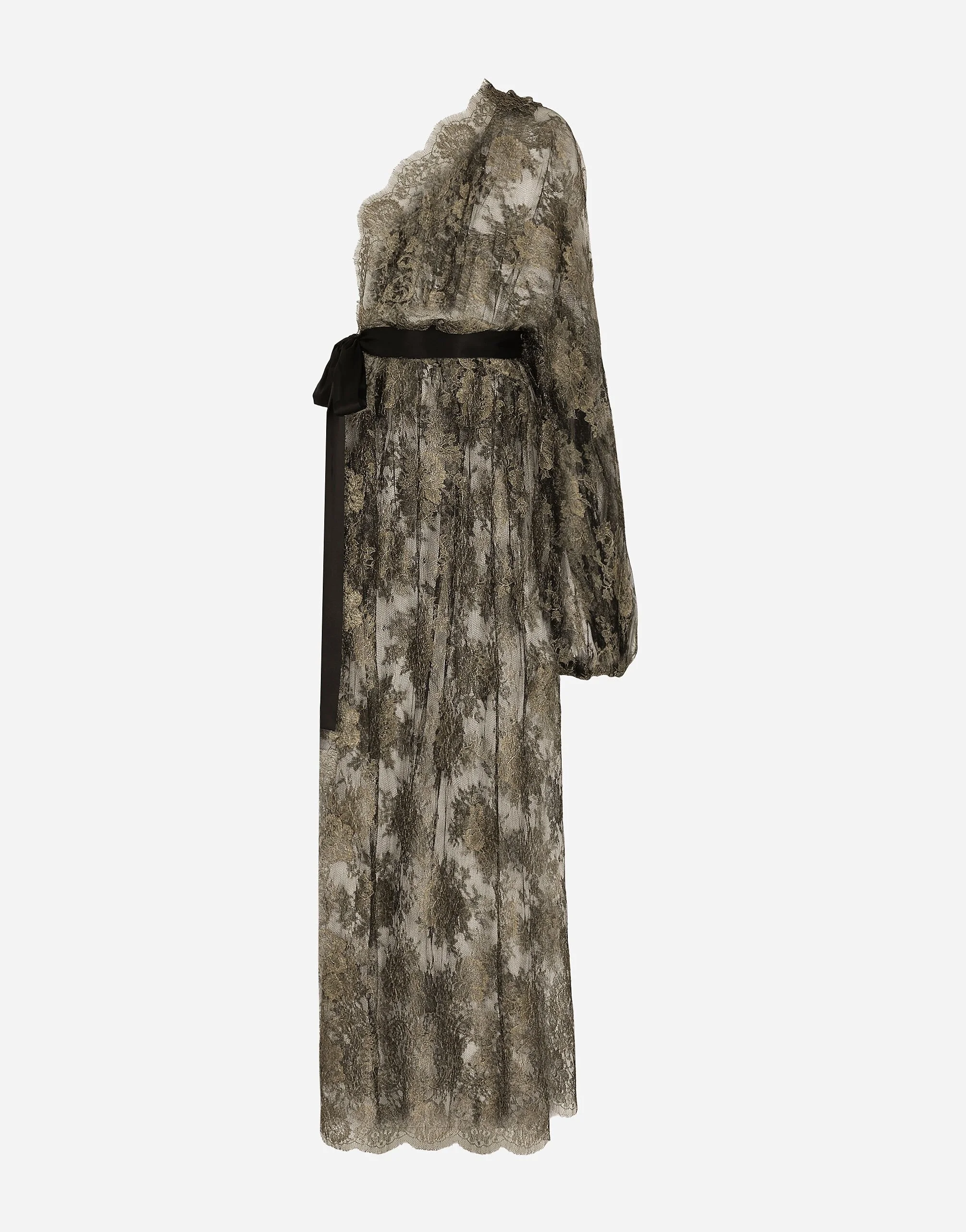 Menswear and womenswear mix and mingle, influencing one another and creating tailoring that embraces endless nuances, from the boldest to the most sophisticated, to define the rules of eternally classy femininity. A monochrome retelling in Nero Sicilia black, embellished by golden touches and rhinestones, adorning clean lines and incorporating stylish fabrics such as velvet, chiffon, lace, organza, and unique mesh details, the expression of authentic beauty for dresses, shirts and accessories. Calf-length one-shoulder lame Chantilly lace dress: • Gold • One-shoulder • Satin waistband • Unlined • Press stud fastenings on the side of the waist and a satin belt • The piece measures 114 cm from the waist down on a size IT 40 • The model is 175 cm tall and wears a size IT 40 • Made in Italy External composition: 45% Polyamide 27% Viscose 18% Polyester 10% Silk