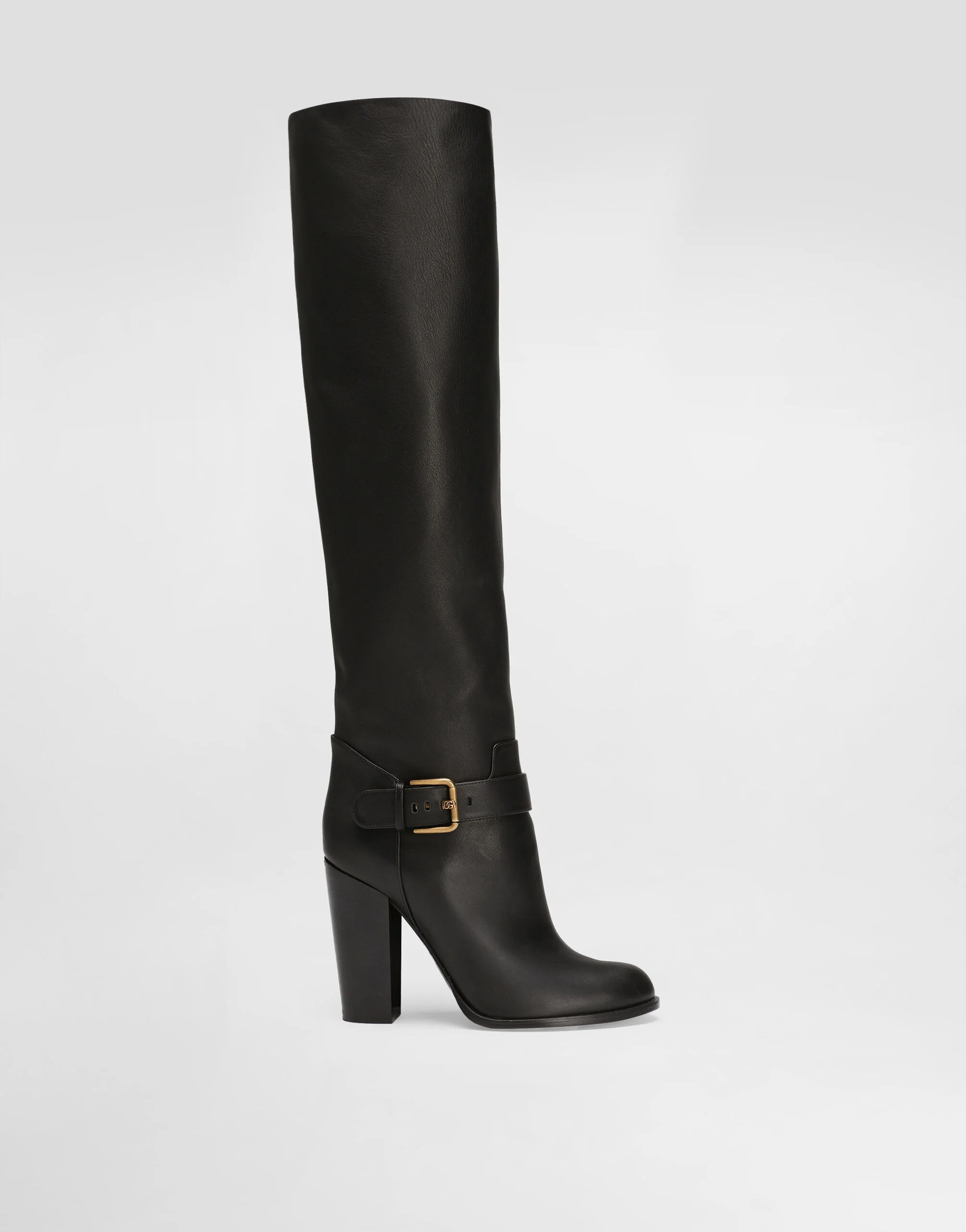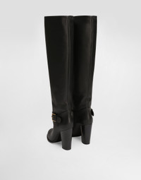 This calfskin boot combines elegance and versatility, perfect for a casual yet sophisticated look. Calfskin boots: • Black • Moss shape • Camargue heel • Leather outsole with DG fire stamp • Leather heel insole with label • Buckle in gold plating • Item equipped with a black cotton bag and black embossed box • Heel height 105 mm • Made in Italy External Composition: 100% Calfskin Internal Composition: 59% Goatskin, 41% Calf Leather