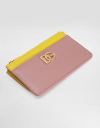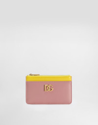 Practical and understated, this card holder comes in calfskin. Ideal for carrying in your pocket or in smaller bags. Plain two-tone calfskin card holder: • Pink and Yellow • One zipped coin pocket on the exterior, plus 5 card slots on the back •Vintage plated brass • Measurements: H9 x W13.5 x D1 cm • Made in Italy External composition: 100% Calfskin Internal composition: 100% Viscose