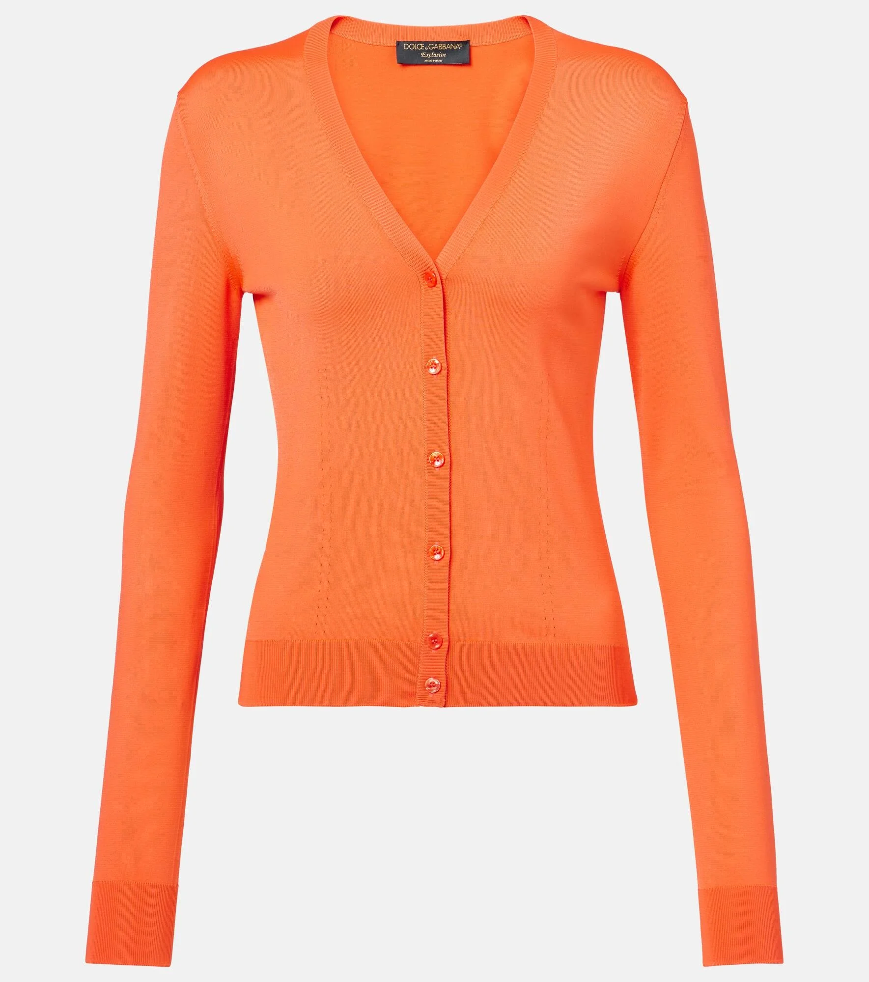 This Dolce&Gabbana cardigan is designed exclusively for Mytheresa. Made from finely knit yarn, this form-fitting style features delicate eyelet details as well as a ribbed hem and cuffs. Product Details - Material: 50% rayon, 37% nylon, 13% elastane - Care instructions: dry clean - Made in Italy - Designer color name: Bright Orange - Item color: orange - Length: regular (hip-length) - Slim fit - Closure: buttoned front - Cuff: ribbed - Hem: ribbed - Collar: V-neck - Sleeves: long-sleeved - Item number: P01061347 Size & Fit - True to size - Fitted - Stretchy fabric - Falls to the hip - The model seen in the picture is 178cm-5'10" and wearing a size %size% - Height of model is 175cm-69" and wears a size IT 40