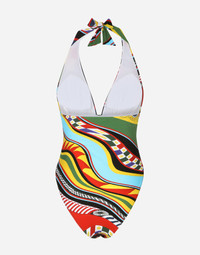 Carretto-print one-piece swimsuit with plunging neckline