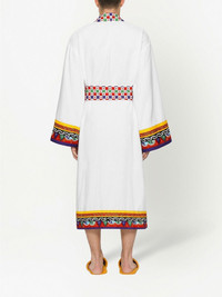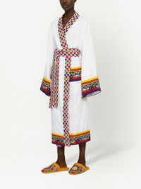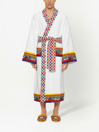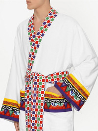 terry bath robe Made in Italy from plush cotton terry cloth, this robe from Dolce & Gabbana is adorned with a folklore-inspired Carretto Siciliano design, found throughout the house's collection and defined by its lively colour scheme. Highlights - White/multicolour - Cotton - Contrasting trim - Shawl lapels - Belted waist - Two front patch pockets - Long sleeves - Straight hem - When buying this unisex item, keep in mind that it is graded in standard men's sizing Made in Italy Composition Cotton 100%
