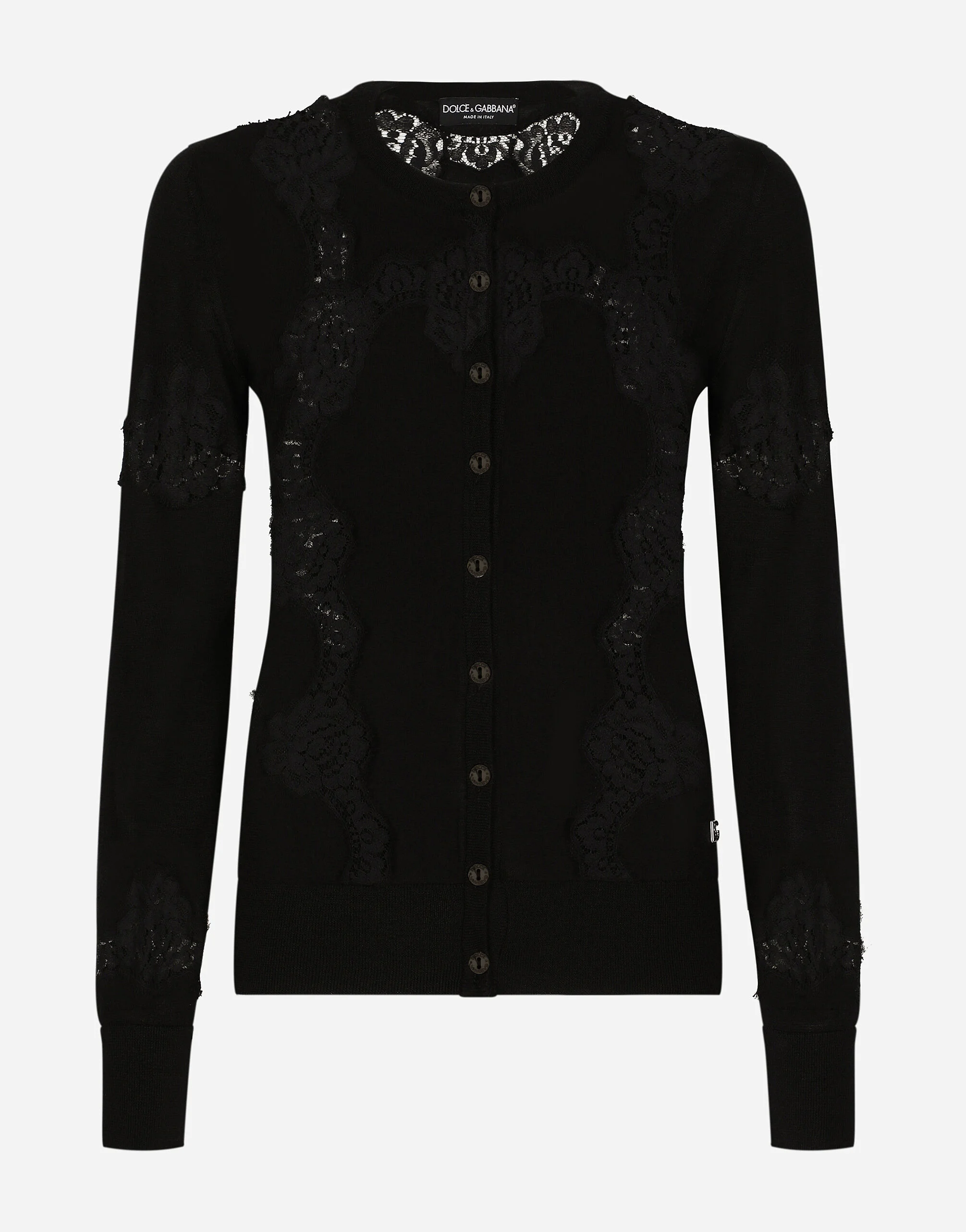Cashmere and silk cardigan with lace inlay: • 18-gauge knit • Round neck • Long sleeves • Regular fit • Fine-rib trims • Branded mother-of-pearl button fastenings at the front • The piece measures 59 cm from the shoulder seam on a size IT 40 • The model is 175 cm tall and wears a size IT 40 • Made in Italy Care And Details External composition: 60% Cashmere 25% Silk 12% Cotton 3% Polyamide