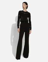 The DNA collection is distinguished by timeless shapes, bringing together three concepts: Sicilian flair, tailoring and sensuality. Nero Sicilia black and optical White predominate and pair with colors that catapult us onto the island of Sicily and make us dream. The designers channel the timeless wardrobe made up of creations that are instantly unmistakable in their simplicity, presenting us with sophisticated beauty loaded with meaning and symbolism that transcends fashion. Cashmere and silk sweater with lace inlay: • Black • 18-gauge knit • Round neck • Long sleeves • French seam armholes • Dense hand • Ribbed neck and hem • Regular fit • The piece measures 60 cm from the shoulder seam on a size IT 40 • The model is 175 cm tall and wears a size IT 40 • Made in Italy External composition: 60% Cashmere 25% Silk 12% Cotton 3% Polyamide