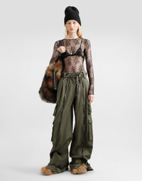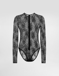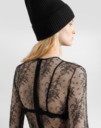 In the Fall/Winter 2025 Fashion Show Collection, shearling jackets, in fur-free versions, reveal slip dresses and create contrast' plays while denim welcomes fabric or Leo print inserts. Sweatshirts are the result of long experimentation with volumes. Evening looks become precious thanks to dresses with special embroideries and luminous touches of sequins and crystals. Sheepskin inserts also unite hats, shoes, and bags, including those with pockets. This black lace bodysuit represents timeless elegance and sophistication, perfect for those looking for a garment that combines sensuality and class. Chantilly lace bodysuit: • Black • With sleeves • Opening in the center back with invisible zip • Opening at the bottom of the gusset with hooks • Made in Italy External Composition: 43% Viscose, 42% Polyamide, 15% Elastane