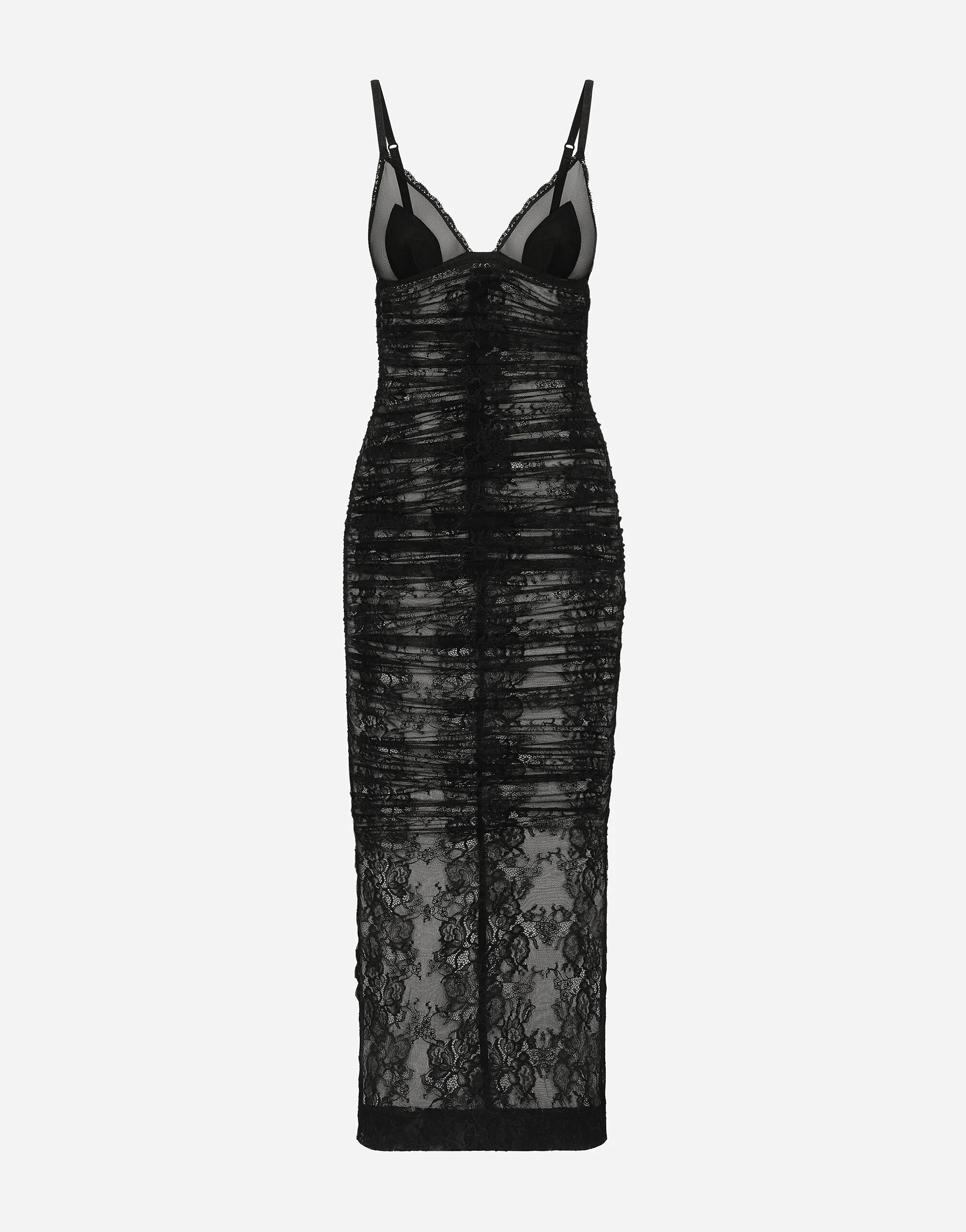 Menswear and womenswear mix and mingle, influencing one another and creating tailoring that embraces endless nuances, from the boldest to the most sophisticated, to define the rules of eternally classy femininity. A monochrome retelling in Nero Sicilia black, embellished by golden touches and rhinestones, adorning clean lines and incorporating stylish fabrics such as velvet, chiffon, lace, organza, and unique mesh details, the expression of authentic beauty for dresses, shirts and accessories. Calf-length stretch Chantilly lace slip dress: • Black • V-neck with bra-style cups • Sleeveless with adjustable shoulder straps • Triangle cups • Unlined • Rear zipper and hook-and-bar fastening • The piece measures 88 cm from the waist down on a size IT 40 • The model is 175 cm tall and wears a size IT 40 • Made in Italy External composition: 60% Polyamide 15% Cotton 15% Spandex 10% Silk