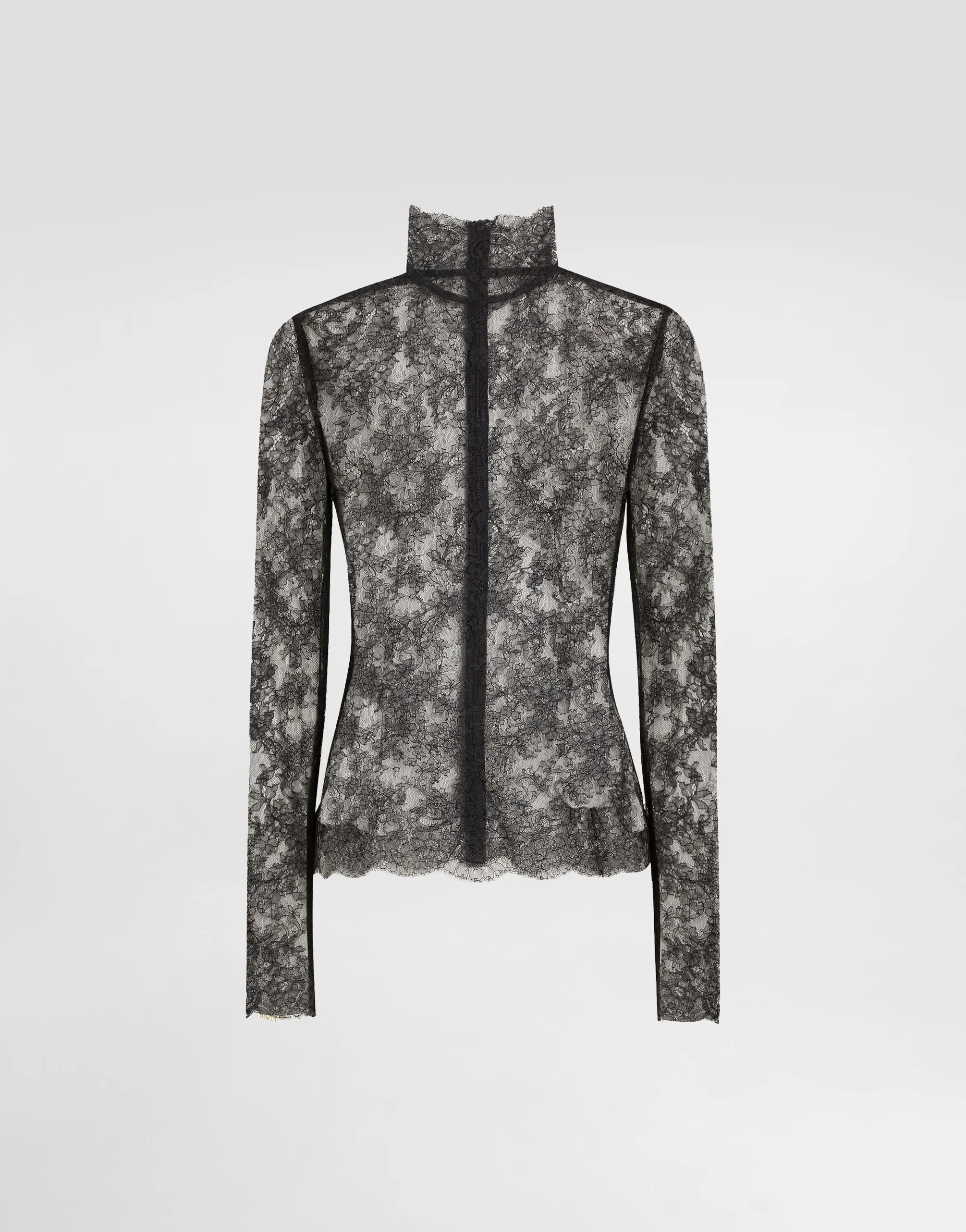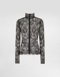 The Everyday Women's Collection reimagines contemporary daily wear with Dolce&Gabbana's signature style codes. Iconic fabrics mix with standout details like embroidered flowers, crystals, and jewel buttons, infusing elegance into every look. Gray animal print accented with green and purple, hyper-geometric jewelry, voluminous shapes and transparencies add unique touches. Men's tweed is reinvented with graphic twists, creating distinctive pieces that reflect refined sensuality. Floral lace turtle-neck top: • Black • High neck • Long sleeves • Fitted waist • Unlined • Zipper fastening at the back • The piece measures 60 cm from the center back on a size IT 40 • The model is 175 cm tall and wears a size IT 40 • Made in Italy External composition: 71% Polyester 29% Viscose