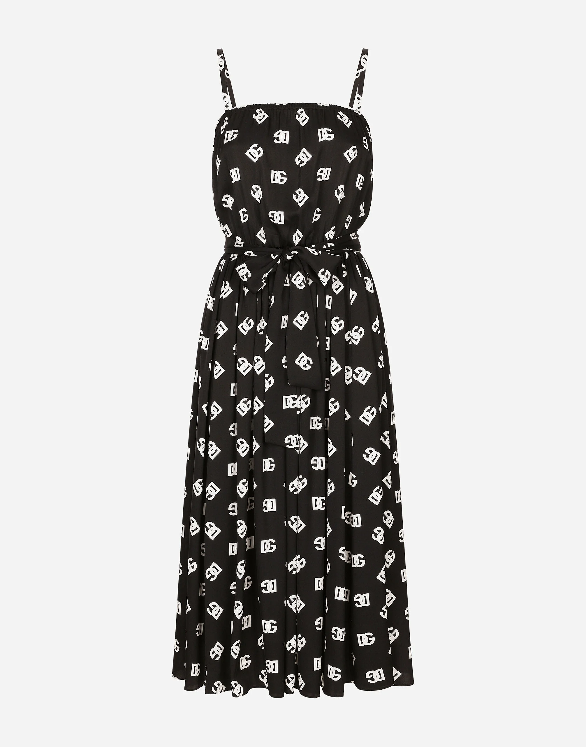 The DNA collection is distinguished by timeless shapes, bringing together three concepts: Sicilian flair, tailoring and sensuality. Nero Sicilia black and optical white predominate and pair with colors that catapult us onto the island of Sicily and make us dream. The designers channel the timeless wardrobe made up of creations that are instantly unmistakable in their simplicity, presenting us with sophisticated beauty loaded with meaning and symbolism that transcends fashion. Silk charmeuse calf-length dress with all-over DG logo print: • Black • Straight neckline with elastic • Sleeveless with shoulder straps • Unlined • Elasticated waistband and belt • The piece measures 80 cm from the waist down on a size IT 40 • The model is 175 cm tall and wears a size IT 40 • Made in Italy External composition: 94% Silk 6% Spandex