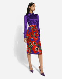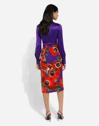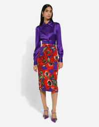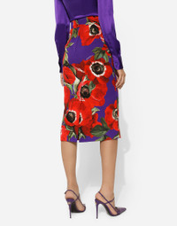 The spirit of the 1960s is taking over the new Flower Power collection. The focus is a head-to-toe floral look built around pairing and layering rose, anemone and floral bouquet maxi-prints. A cosmopolite poised between playful and sexy, this women interprets the austerity and elegance of the 1960s, harking back to boldly opulent imagery that here at Dolce&Gabbana is condensed and reinterpreted through silhouettes, ample proportions and airy shapes, bringing femininity and sensuality to the forefront. Silk charmeuse calf-length skirt with anemone print: • Multi-colored • High-waisted • Leopard-print stretch silk satin lining • Rear zipper and hook-and-eye fastening • The piece measures 75 cm from the waist down on a size IT 40 • The model is 175 cm tall and wears a size IT 40 • Made in Italy The difference in the print placement that you may find on this product is a feature of Dolce&Gabbana’s “Handmade” pieces. A detail that makes every garment or accessory unique and exclusive. External composition: 94% Silk 6% Spandex Internal composition: 93% Silk 7% Spandex