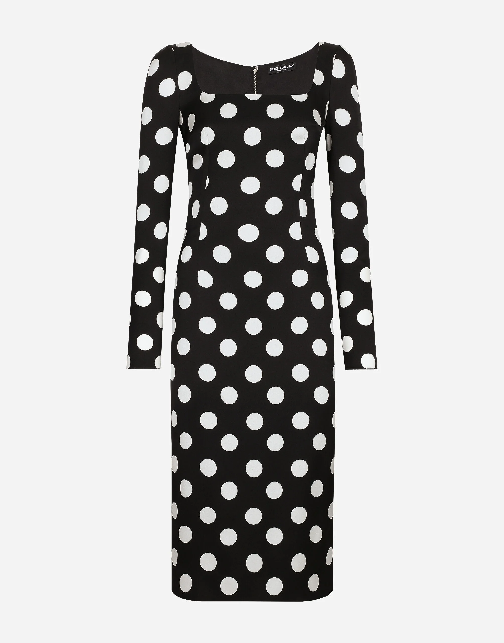 In the Black Sicily Collection, black, the absolute protagonist, becomes sensual black, sheer black, Dolce&Gabbana black. The key concept is “Black on Black”. Playing around with proportions, volumes, layered fabrics and sheer details, this style becomes absolute, bold and sexy. Unique and unmistakable, it is conveyed through the contrasts between glossy and matte fabrics, lines, volumes and special details, thereby expressing a woman’s various personalities and the true identity of Dolce&Gabbana. Silk charmeuse sheath dress with polka-dot print: • Black • Square neckline • Long sleeves • Stretch silk satin lining • Invisible zipper and hook-and-eye fastening on the back • The piece measures 75 cm from the waist down on a size IT 40 • The model is 175 cm tall and wears a size IT 40 • Made in Italy External composition: 91% Silk 9% Spandex Internal composition: 92% Silk 8% Spandex