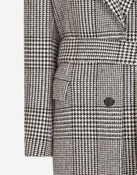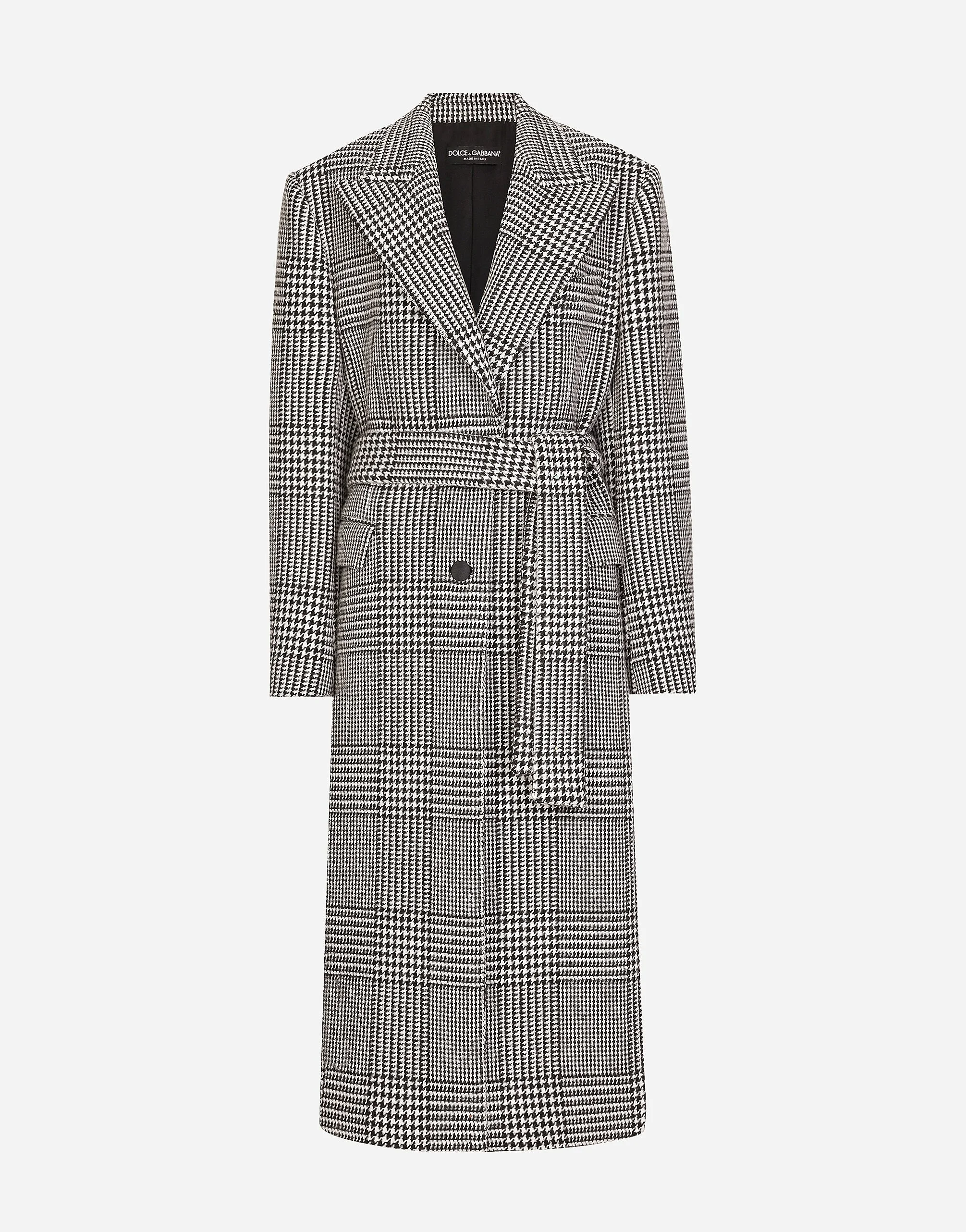 Inspired by 80s fashion photography, the Black Sicily collection masterfully blends masculine and feminine elements, pairing tailored cuts and corset details for the FW 24/25 season. A new vision of the iconic Nero Sicilia black is conveyed through contemporary and sensual looks: jackets and skirts in all-over glen plaid pair with openwork socks, while the 50s-inspired Mun shoes with Eva heel go with the houndstooth Sicily bag featuring crocodile-print leather inserts. Single-breasted houndstooth check wool coat with belt: • Gray • Single-breasted • Peak lapels • Long sleeves • Flap pockets • Central rear vent • Silk satin lining • Satin-covered button fastenings and belt • The piece measures 130 cm from the center back on a size IT 40 • The model is 175 cm tall and wears a size IT 40 • Made in Italy External composition: 80% Virgin Wool 20% Polyamide Internal composition: 100% Silk