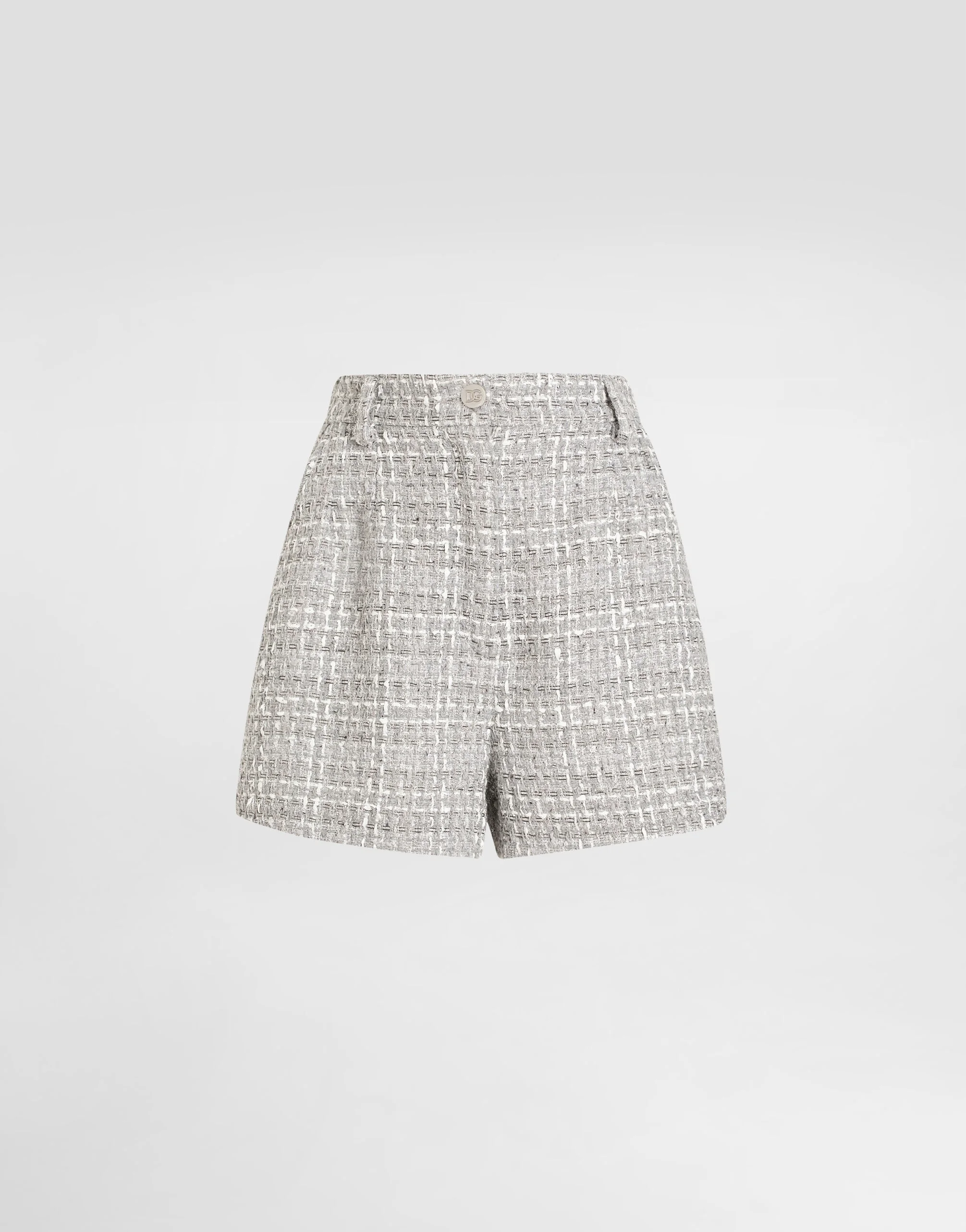 The Everyday Women's Collection reimagines contemporary daily wear with Dolce&Gabbana's signature style codes. Iconic fabrics mix with standout details like embroidered flowers, crystals, and jewel buttons, infusing elegance into every look. Gray animal print accented with green and purple, hyper-geometric jewelry, voluminous shapes and transparencies add unique touches. Men's tweed is reinvented with graphic twists, creating distinctive pieces that reflect refined sensuality. Lame tweed boucle shorts: • Gray • High-waisted • Slant pockets • Belt loops • Inner leg: 6 cm • Hem: 34 cm • Zipper and button fastening with DG logo • The model is 175 cm tall and wears a size IT 40 • Made in Italy External composition: 25% Viscose 18% Cotton 18% Polyamide 16% Polyester 12% Acrylic 06% Linen 05% Metallic Polyester Internal composition: 92% Silk 8% Spandex