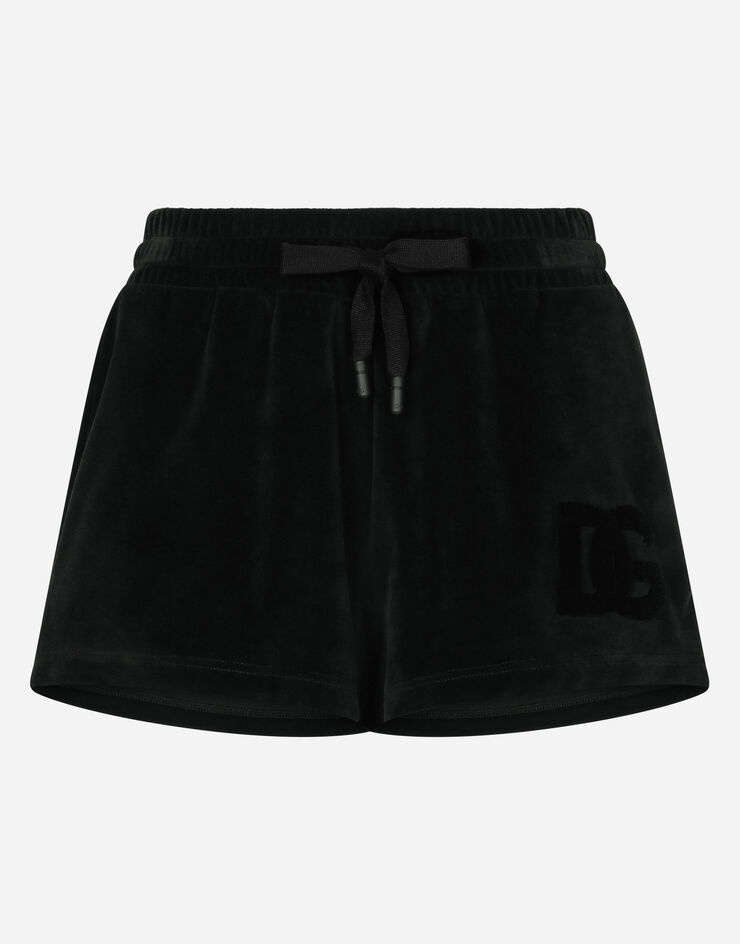 Chenille shorts with embroidered Dolce&Gabbana logo: • Black • High waist with elasticated waistband and drawstring • Inner leg: 5 cm • Hem: 34 cm • The model is 175 cm tall and wears a size IT 40 • Made in Italy Care And Details External composition: 70% Cotton 30% Polyester